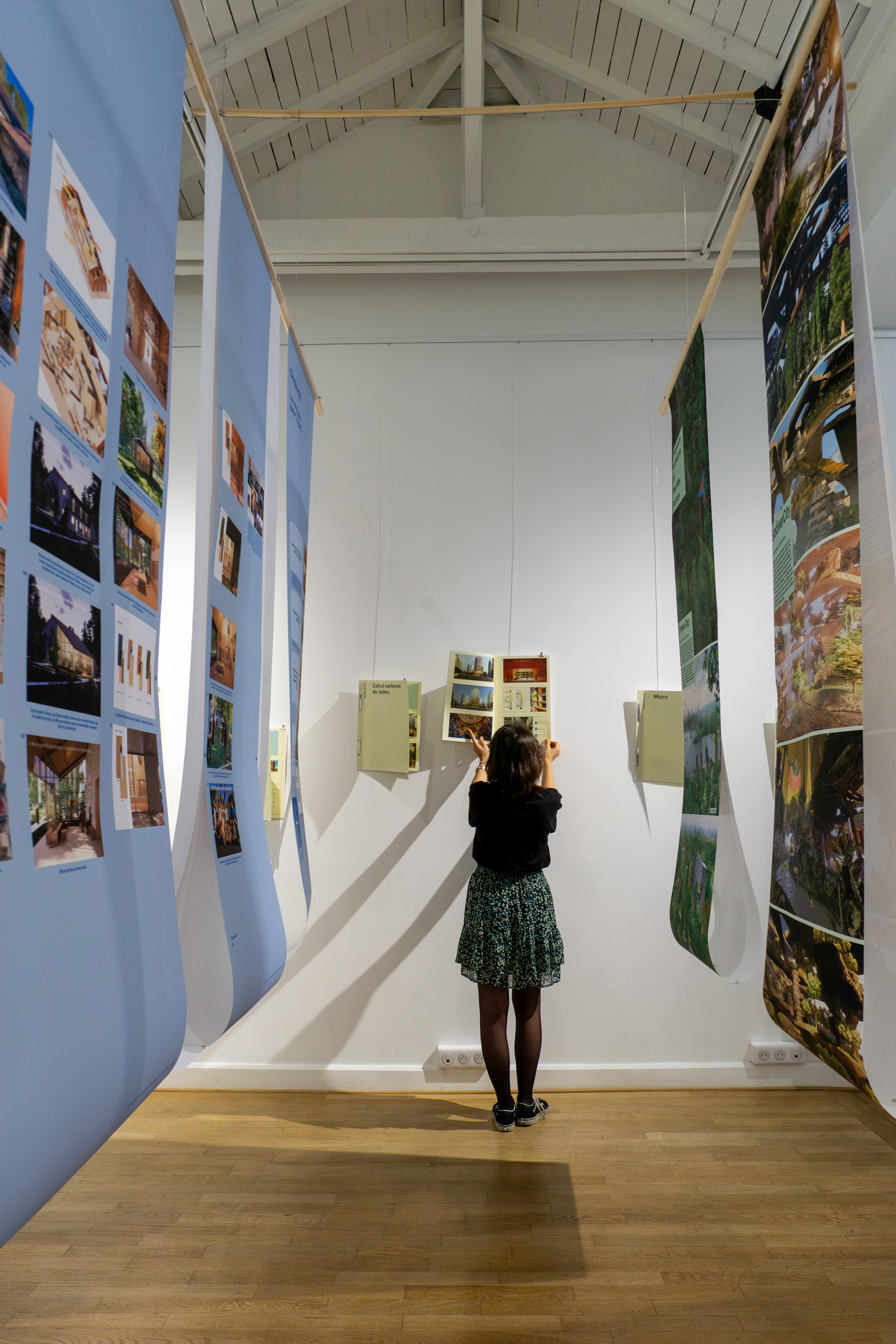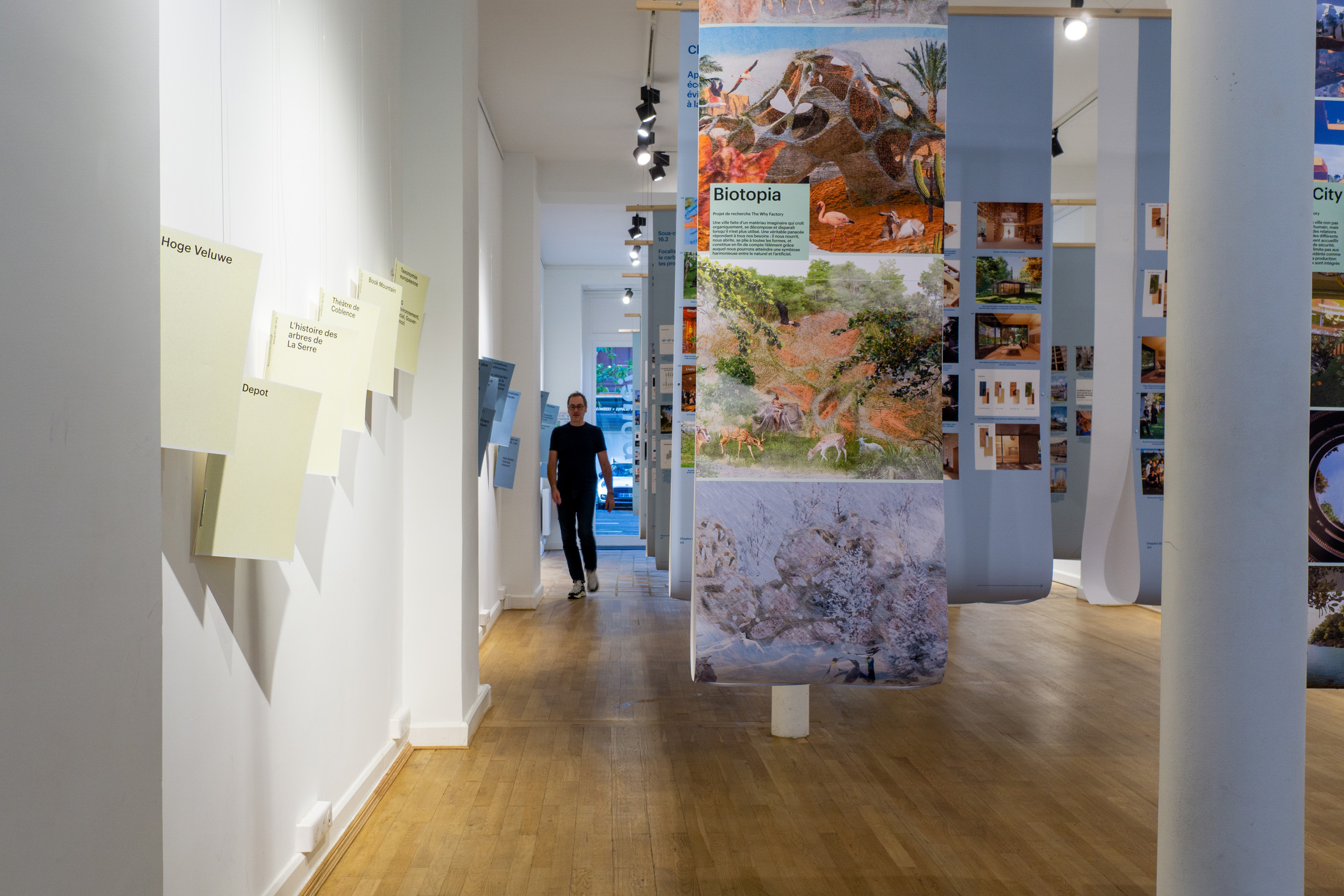 Storytelling, real-life examples, and practical tools combine to demonstrate how MVRDV strives to create truly sustainable architecture. At the centre of the main space of the Atelier Néerlandais is a 21-chapter storyline of their evolving approach, presented on hanging paper banners that immerse visitors in the space. The storyline highlights everything from MVRDV’s early evangelism for density and mobility, to its efforts to implement sustainability in its own operations with vegetarian lunches and the creation of The Green Dream Foundation to offset its travel emissions, and from its missteps in relying too heavily on sustainability consultants, to the foundation of MVRDV NEXT, a combined climate and technology unit within the office that helps to drive the firm’s current focus on carbon.