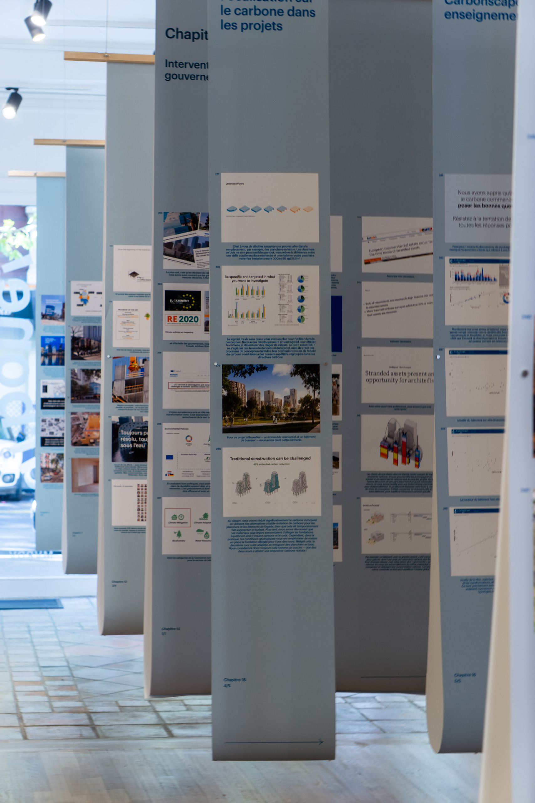 On the walls of the main gallery space, visitors will discover a series of 36 hanging booklets. These include 24 anecdotes of how a push for low-carbon projects works in practice, from a look into the perverse incentives that cause engineers and other consultants to advise against sustainable solutions. The remaining booklets present 12 “carbon cases” showing calculations of the embodied carbon of MVRDV projects using the software CarbonSpace – which MVRDV will soon launch for public use. These carbon cases provide transparency into the methodology MVRDV now uses to measure, and more importantly change, the climate impact of its projects.