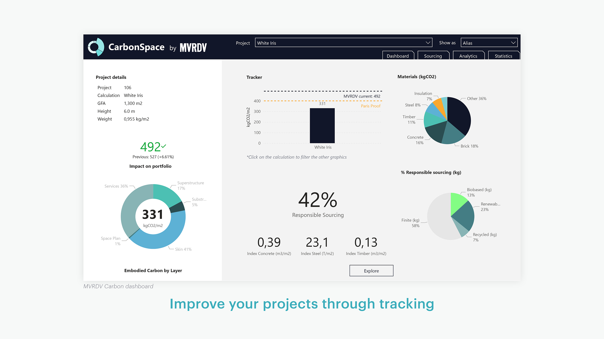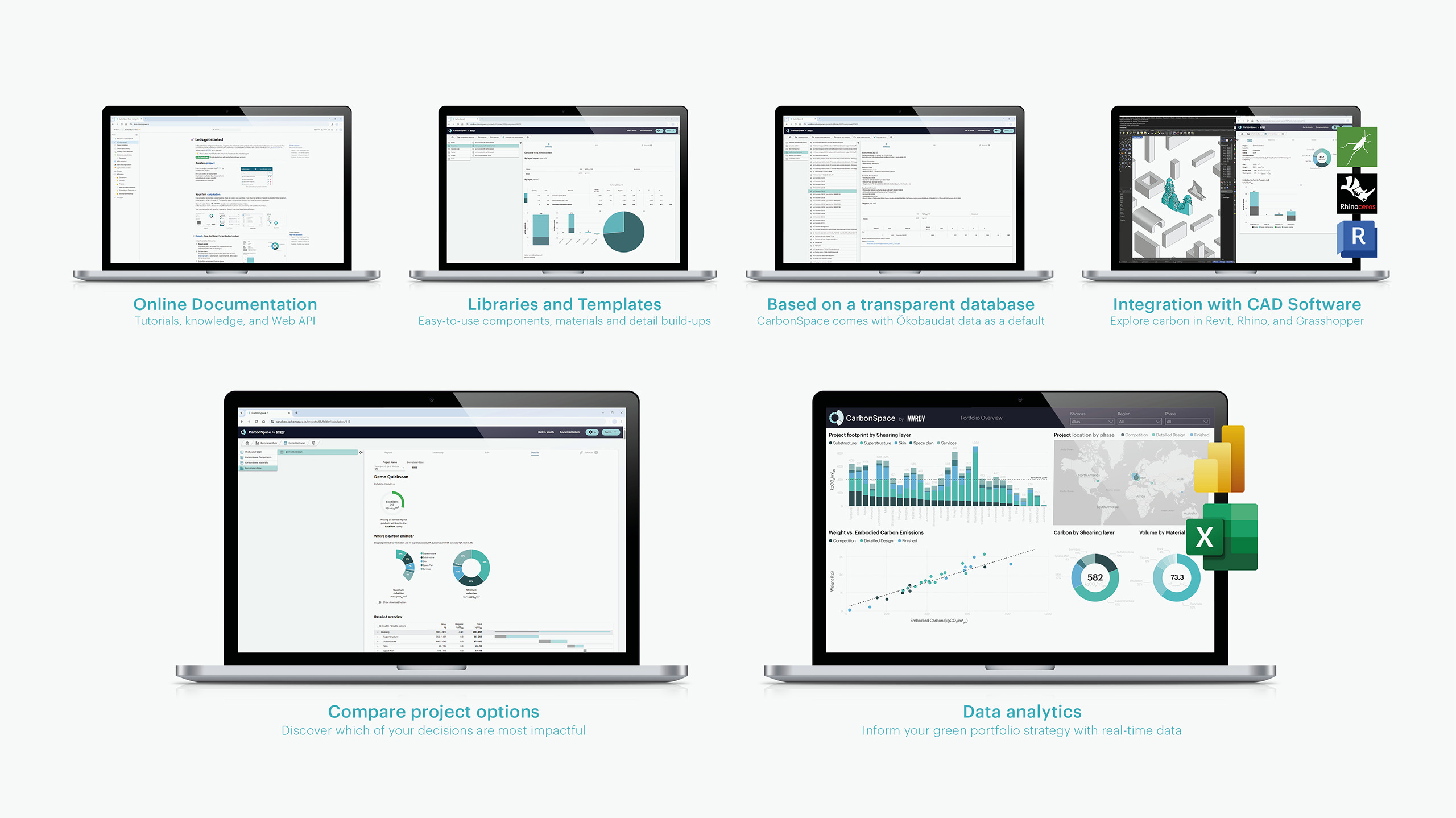Users can further amplify the power of CarbonSpace thanks to an openly accessible API, which allows users to connect the tool to Rhino, Revit, or to deliver data to Microsoft’s Power BI tool, creating useful data visualisations. In the case of MVRDV, the latter capability was used to create a dashboard comparing the carbon emissions of all the firm’s projects, and tracking the progress of the entire portfolio towards the 2030 climate targets. In a similar way, other users will be able to create their own dashboards that meet their organisation’s specific needs.