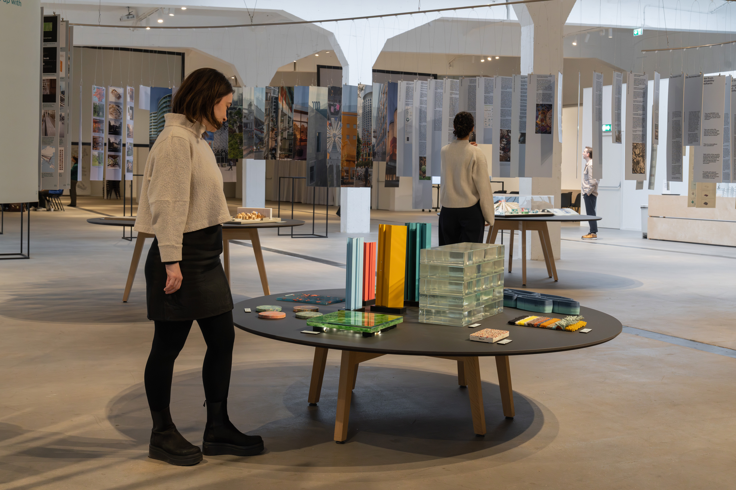In the exhibition space, tables display a selection of low-carbon materials, many of which were specifically created for MVRDV projects. Visitors will also find a selection of models of completed transformation projects and a video projection covering various topics within the realm of sustainability. The design of the Carbon Confessions exhibition itself also follows the message of the exhibition; carbon emissions were deduced as far as possible by reusing materials from previous editions. For example, the railing and panels were recycled from the exhibitions in Munich and Berlin, while the furniture is on loan from the Keilepand, avoiding the purchase of new furniture.
