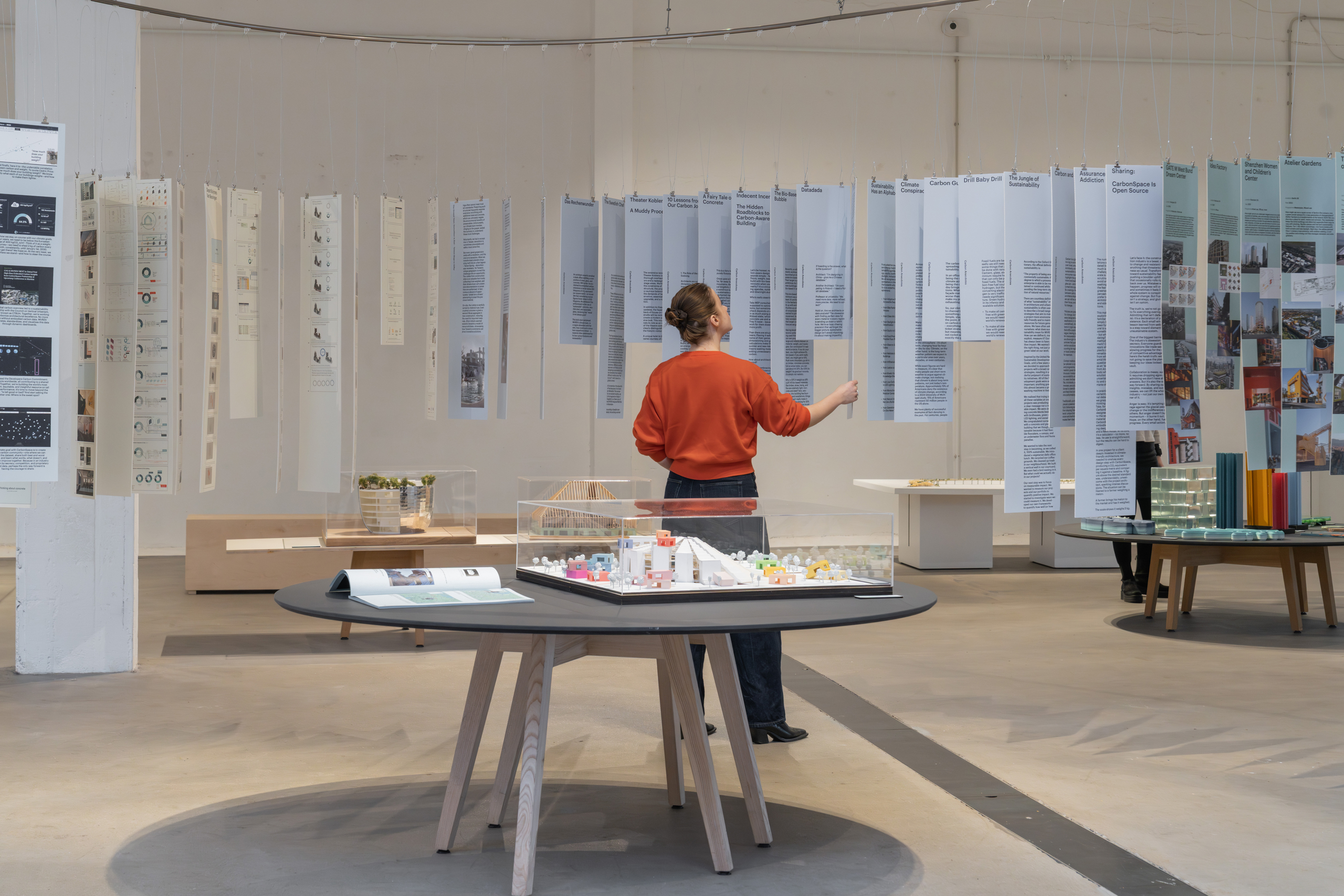 In the centre of this room is a “carousel” of panels – mounted on a circular rail that was loaned from the gallery’s previous exhibition – that provide 22 anecdotes of how a push for low-carbon projects works in practice, from a look into the perverse incentives that cause engineers and other consultants to advise against sustainable solutions to the story of a German builder who proved unexpectedly excited about the potential of rammed earth walls. Accompanying these anecdotes are 12 “carbon cases” showing calculations of the embodied carbon of MVRDV projects using the software CarbonScape – which MVRDV will soon launch for public use. These carbon cases provide transparency into the methodology MVRDV now uses to measure, and more importantly change, the climate impact of its projects.