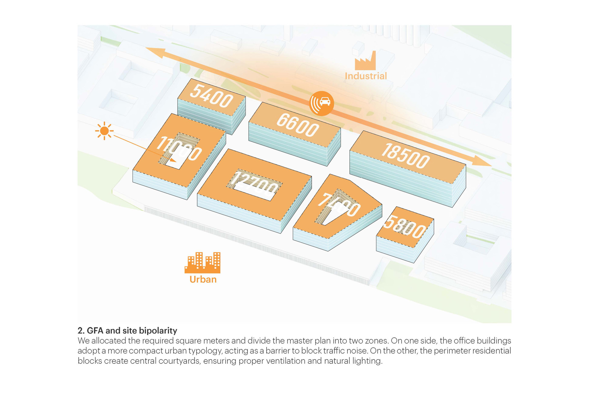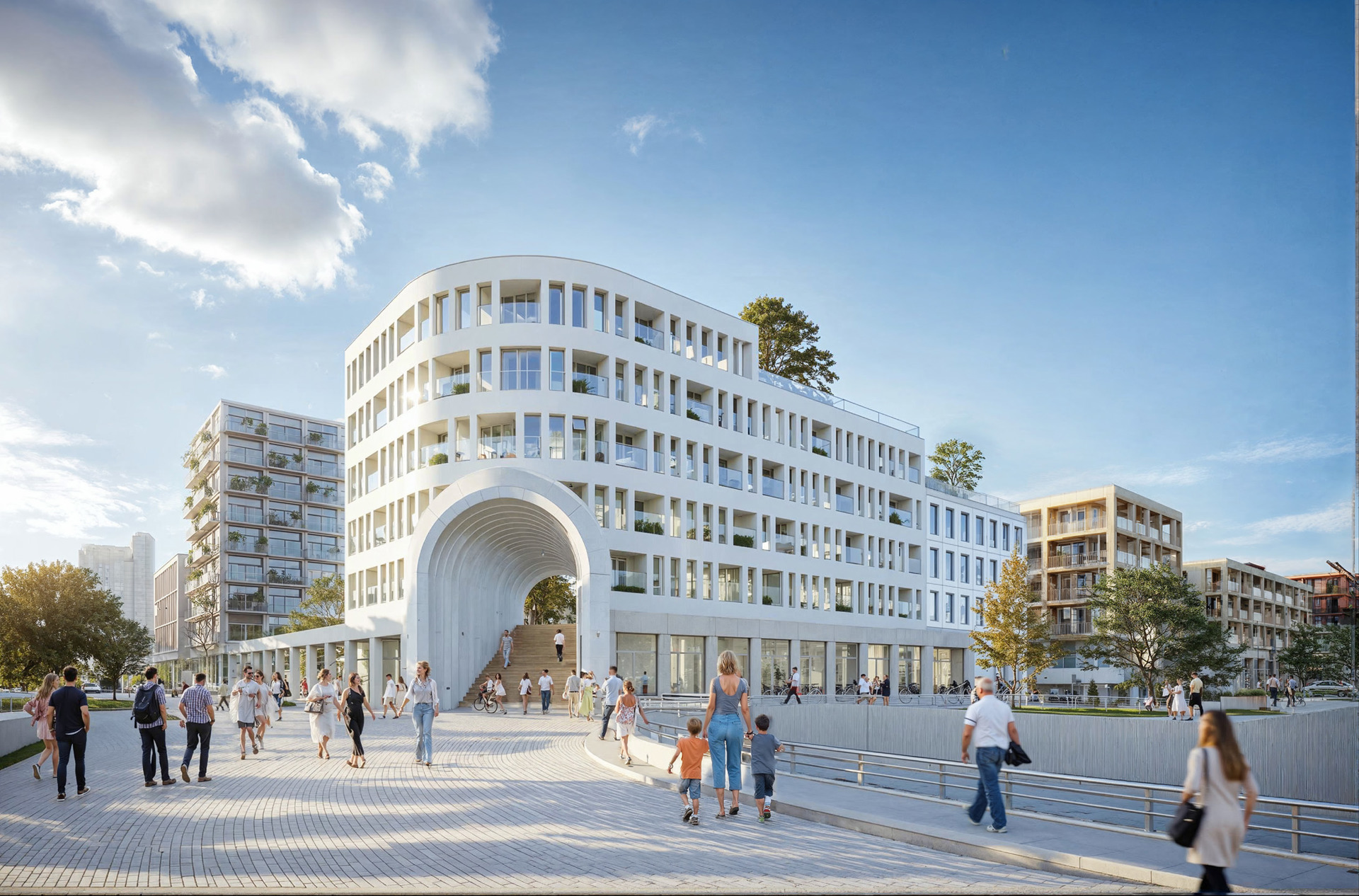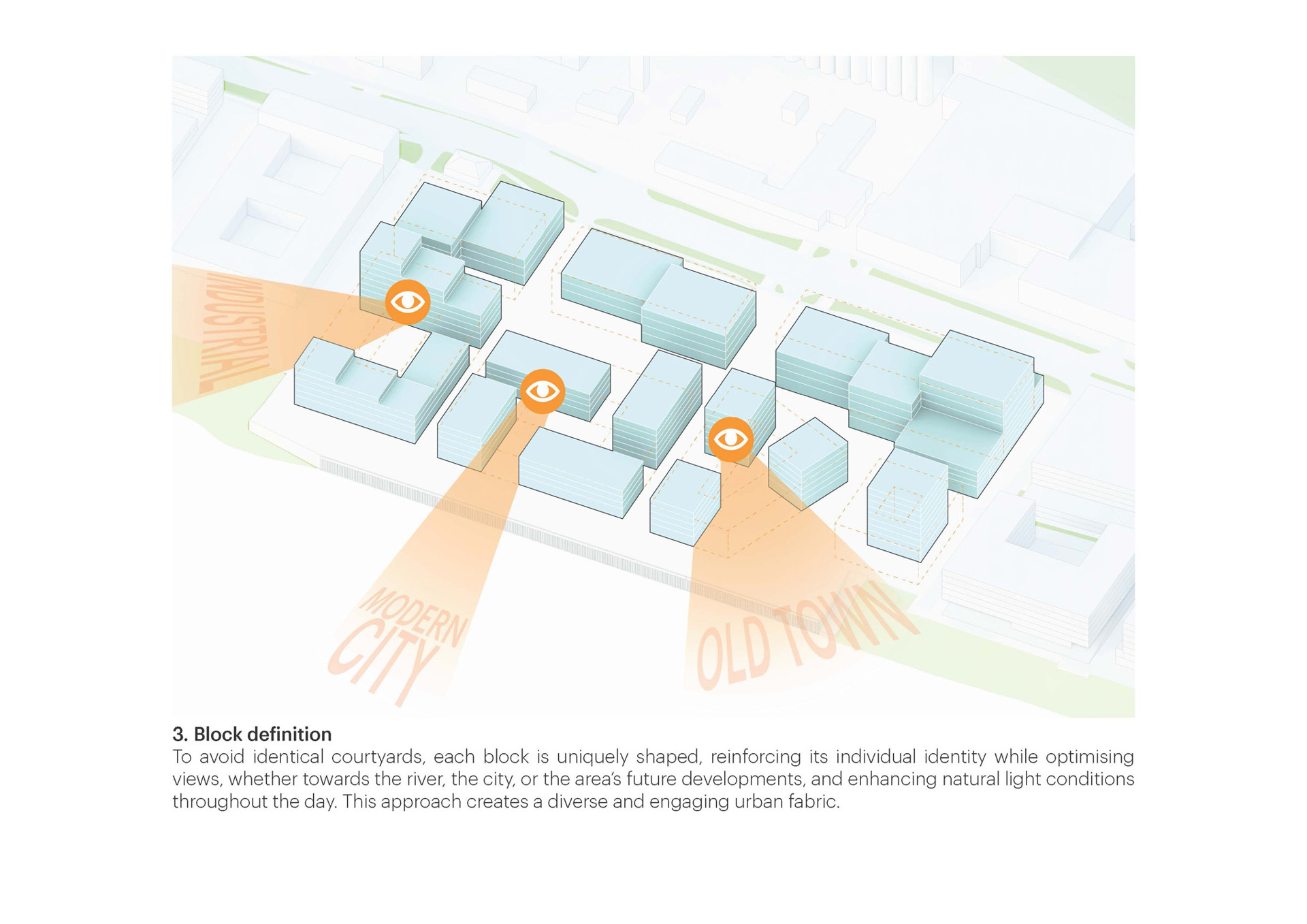 The design places residential functions to the north, oriented to capture sunlight and views while minimising shadows on the river’s edge to create an inviting promenade. On the southern part of the site, office blocks and a mobility hub are arranged to create an acoustic barrier, shielding public spaces and homes from the noise of traffic on H. ir O. Minkovskių Street.