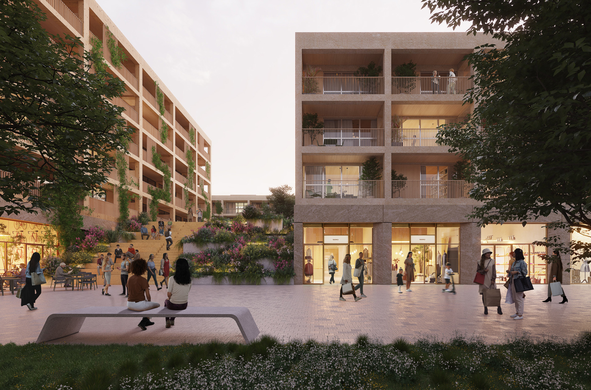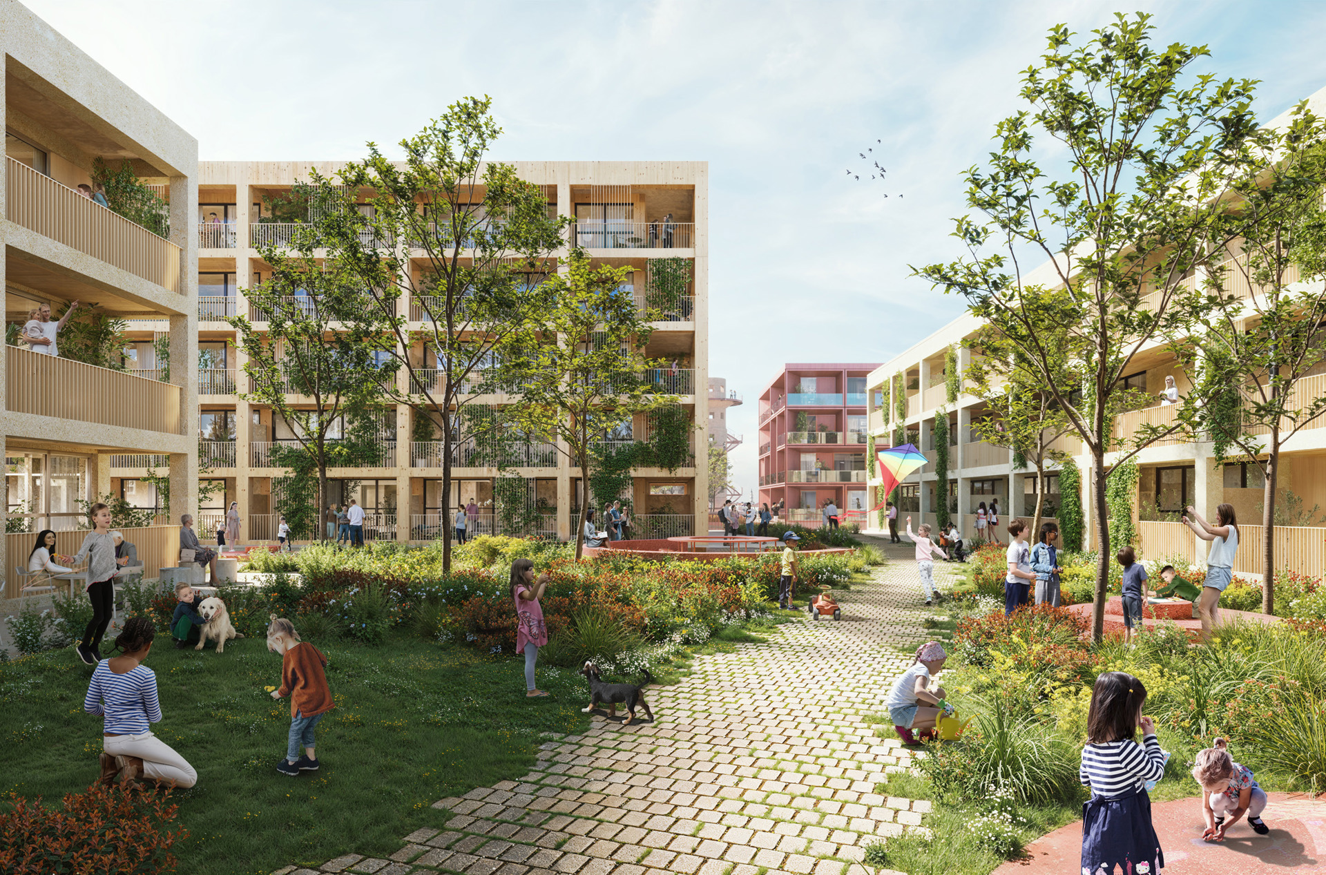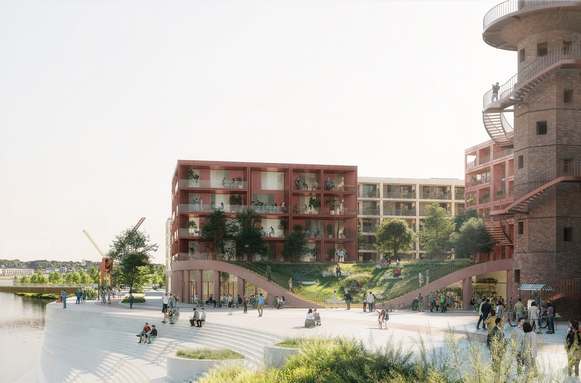 The masterplan recalls the area’s industrial past through its use of materials and colours. The 15-hectare site once stored and shipped clay, sand, peat, and gravel, and these earthy tones return to the site in the form of the building’s façades. The colours are arranged as a gradient, with phase one characterised by the vivid reds of clay, phase two by lighter, sandy tones, and phase three by the light greys and whites of gravel. The plinth level throughout all three phases unifies the neighbourhood with its rich browns inspired by the colours of peat.