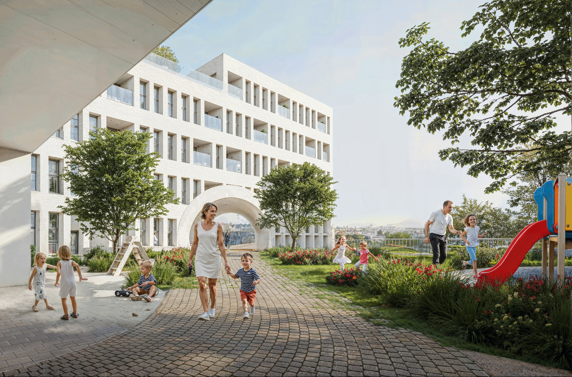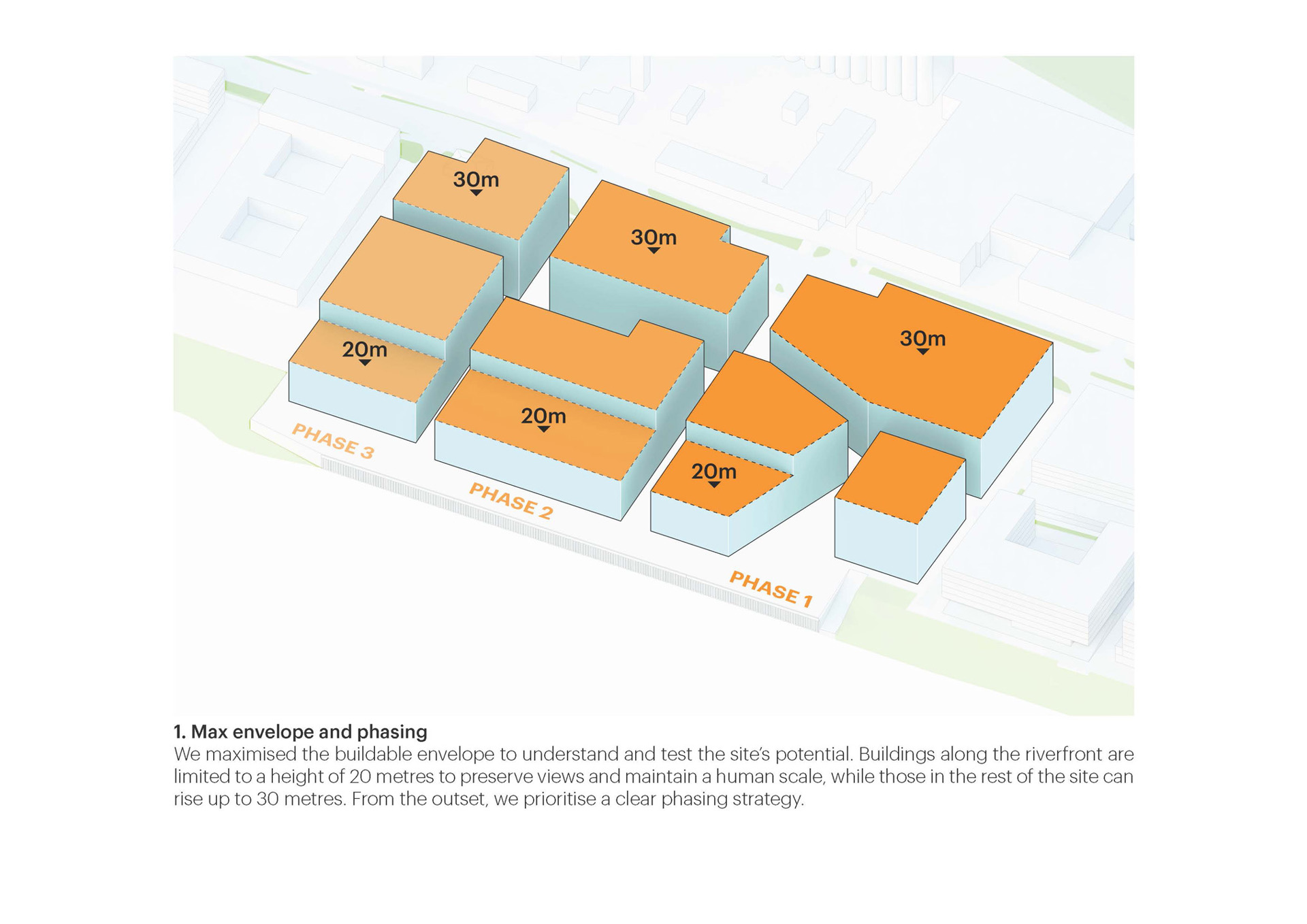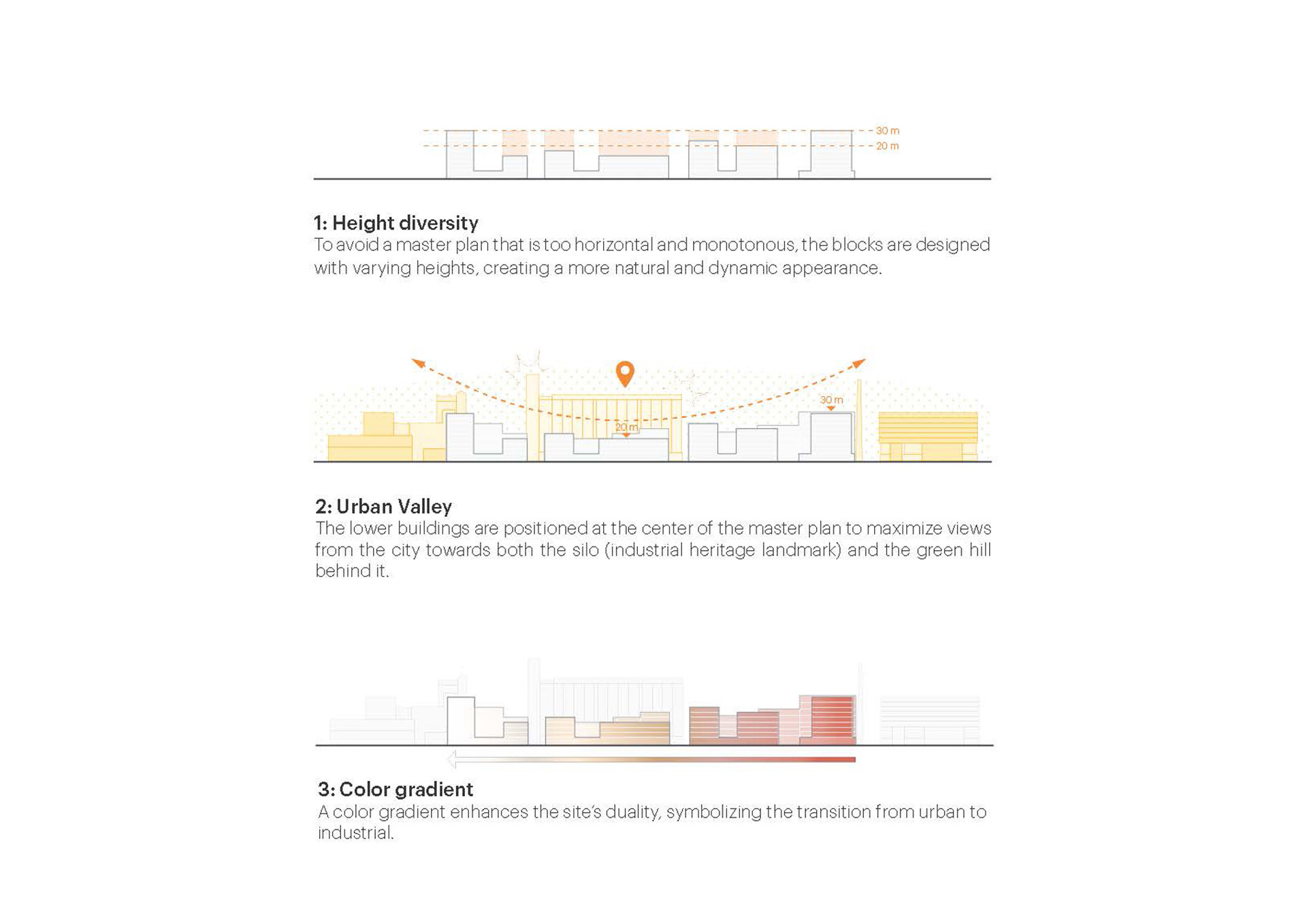 Above the plinth level, the buildings vary in height to create a valley-like profile, preserving views from the city centre towards the eye-catching silo building that is a significant element of the area’s industrial heritage. The masterplan is divided into three phases, with each phase having its own characteristic building shape: the first phase is envisaged as a family of towers; the second phase includes more long, low blocks; and the third includes step-shaped buildings that create more terraces for residents and workers in the buildings.