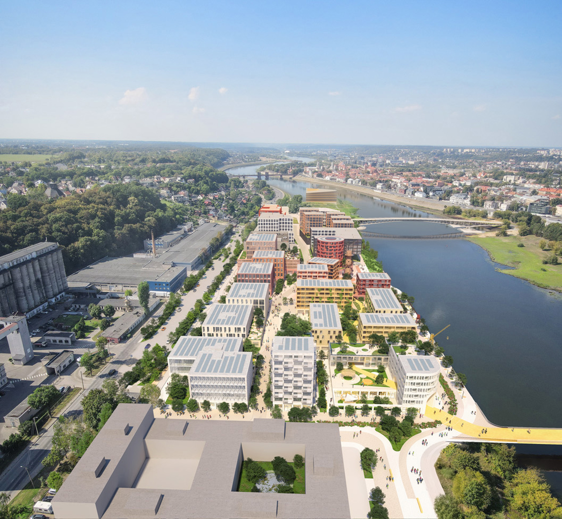 Until now, the left bank of the Nemunas has been characterised by industrial uses. Some of these are now being replaced by Nemunaičiai, an emerging neighbourhood being planned in multiple phases by developer SBA Urban. Catalysed by a pedestrian bridge that is soon to connect Kaunas’ historic city centre, the neighbourhood represents a critical moment in the development of Kaunas, as the city’s urban core expands to the other side of the river.