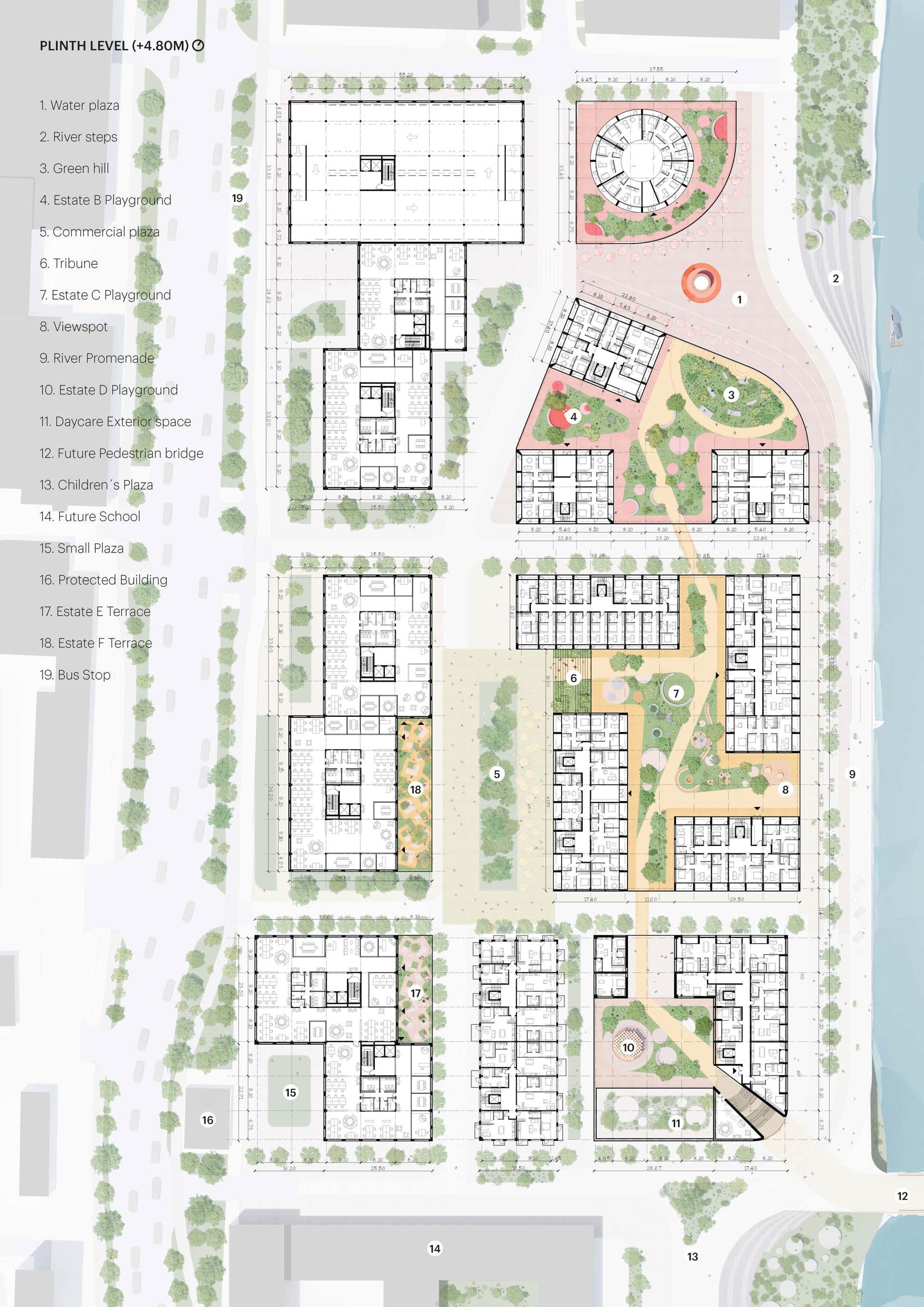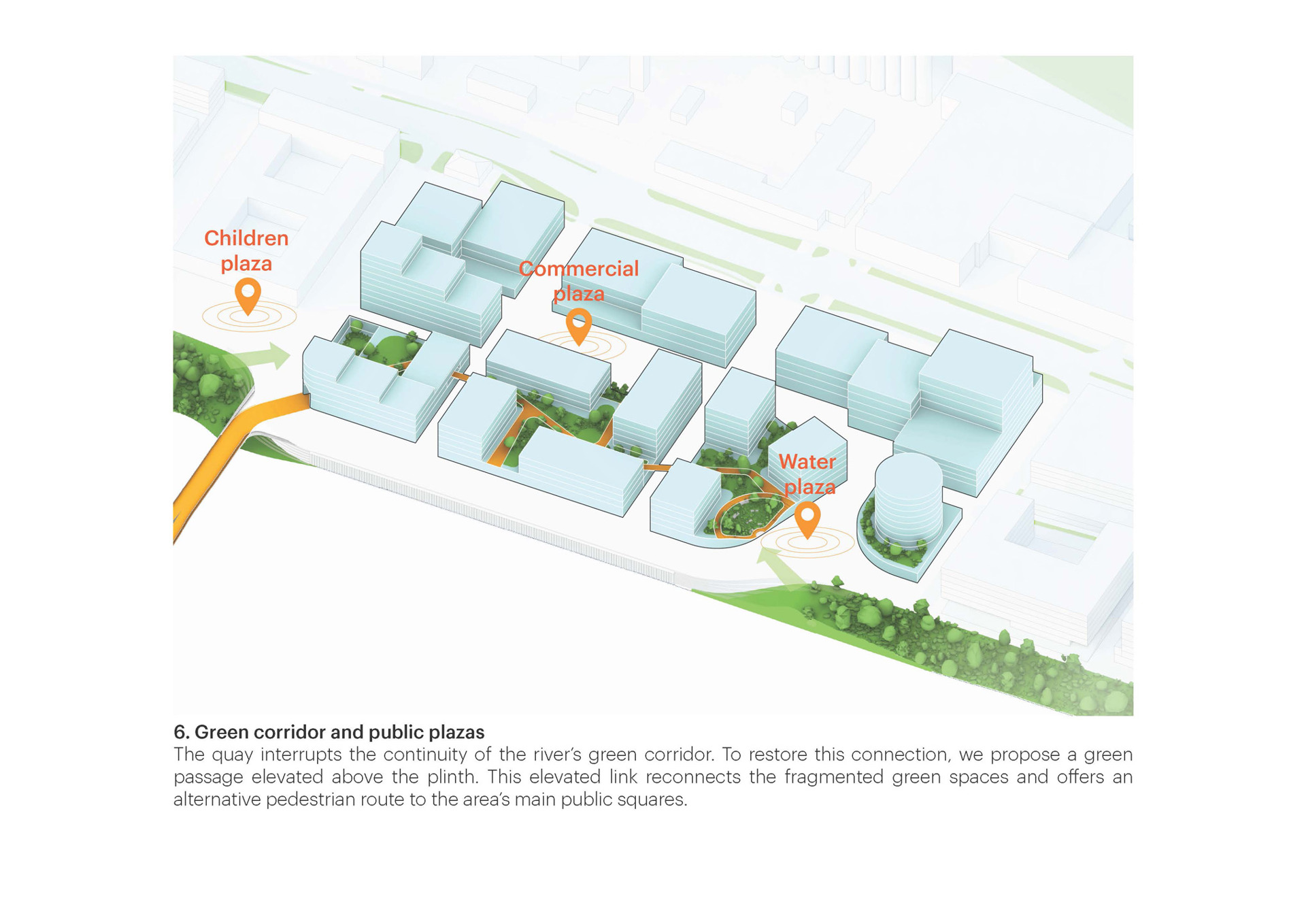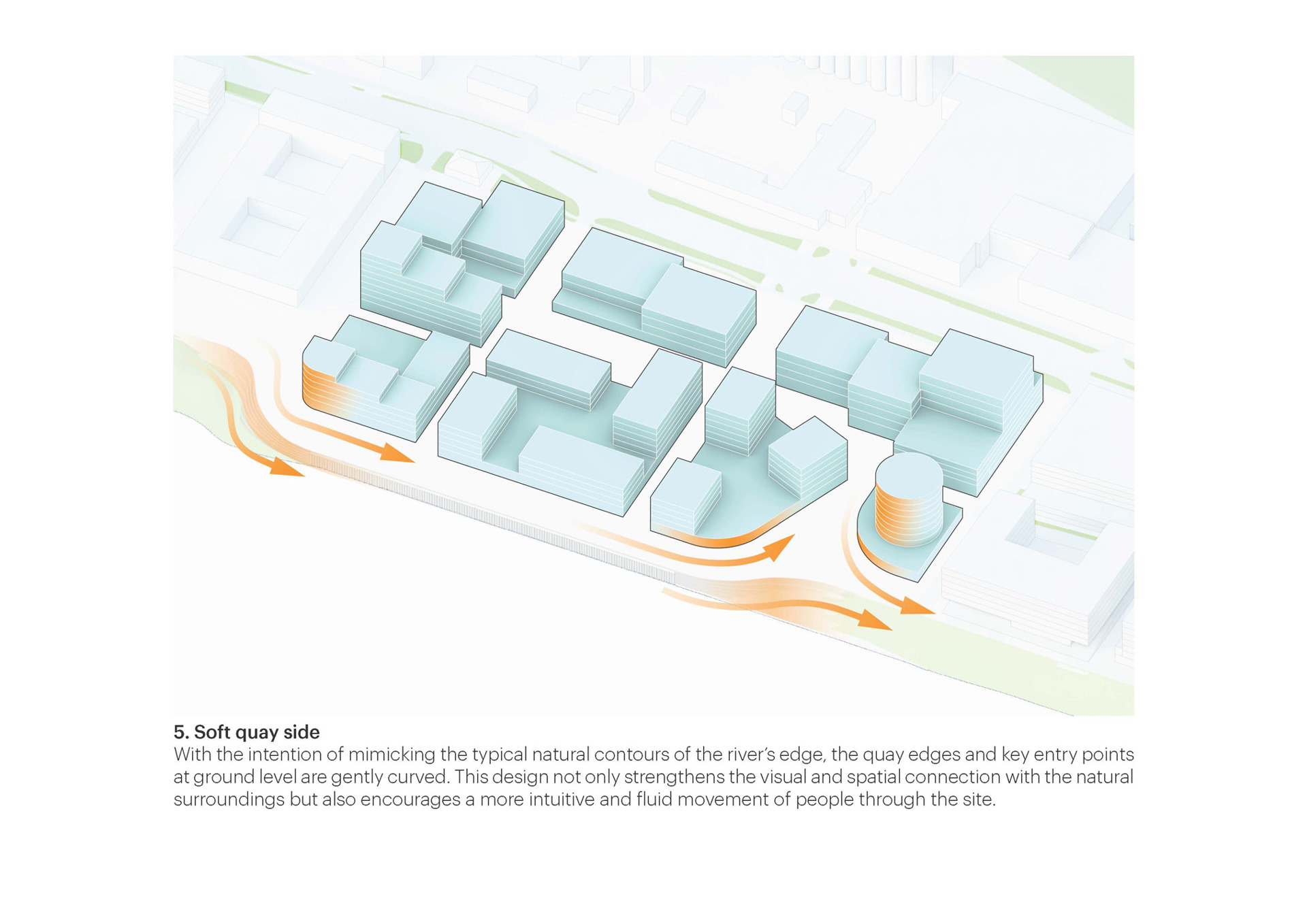 A key element of the proposal are the single-storey plinths that unify each block. With their deep floorplans, these plinths host commercial spaces to enhance street life. In the residential blocks, the plinth roofs become elevated courtyards, with green landscaping that extends the public realm vertically, providing community gardens and recreation areas for residents. Three of the blocks are connected by bridges, allowing movement across the site on multiple levels and re-establishing the continuous green route along the riverbank that is interrupted by the site’s quay wall. To provide access to this upper route, a staircase rises through a grand archway on the eastern end, while on the western end, a tribune staircase doubles as a grandstand for summer performances in the plaza below.