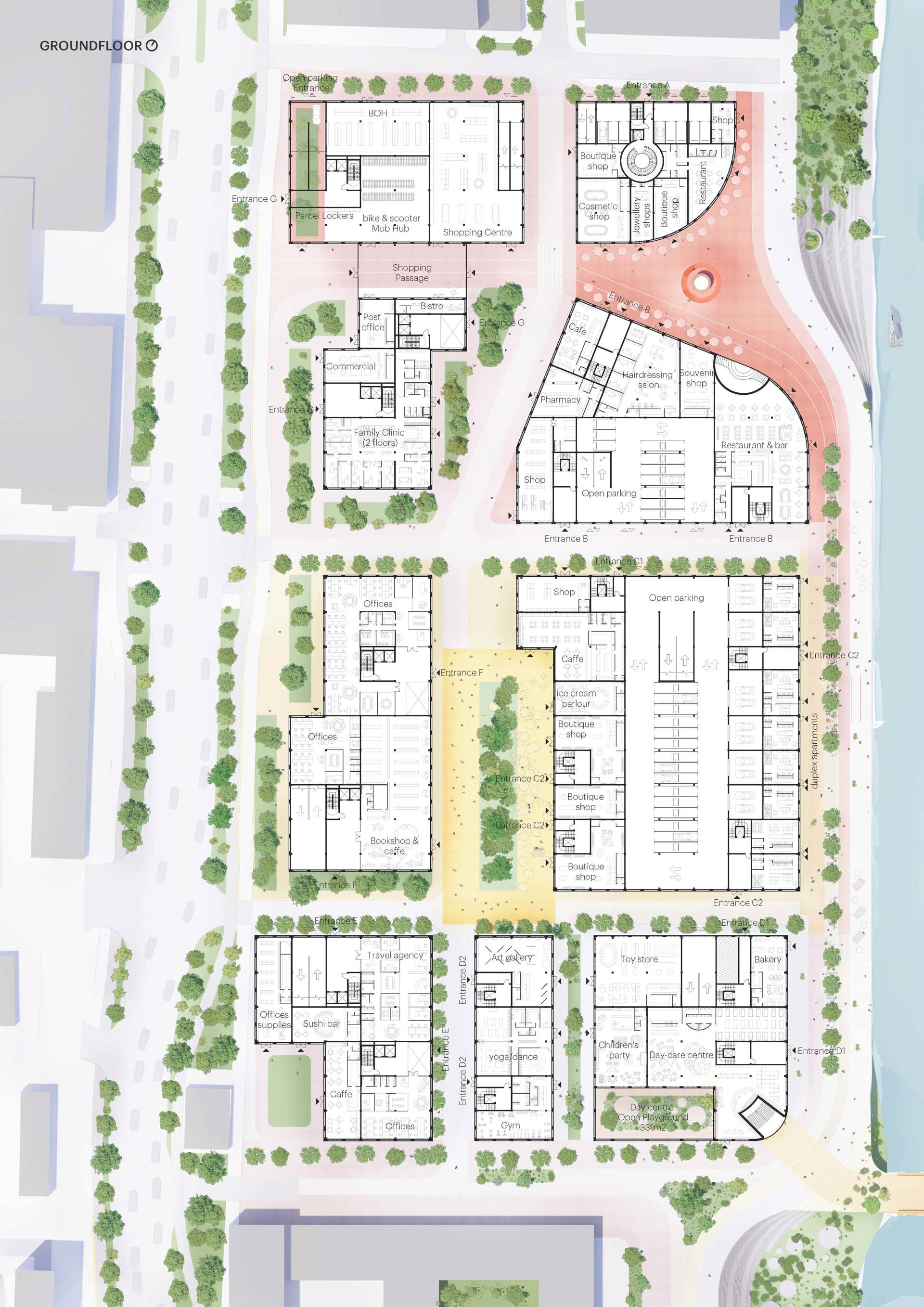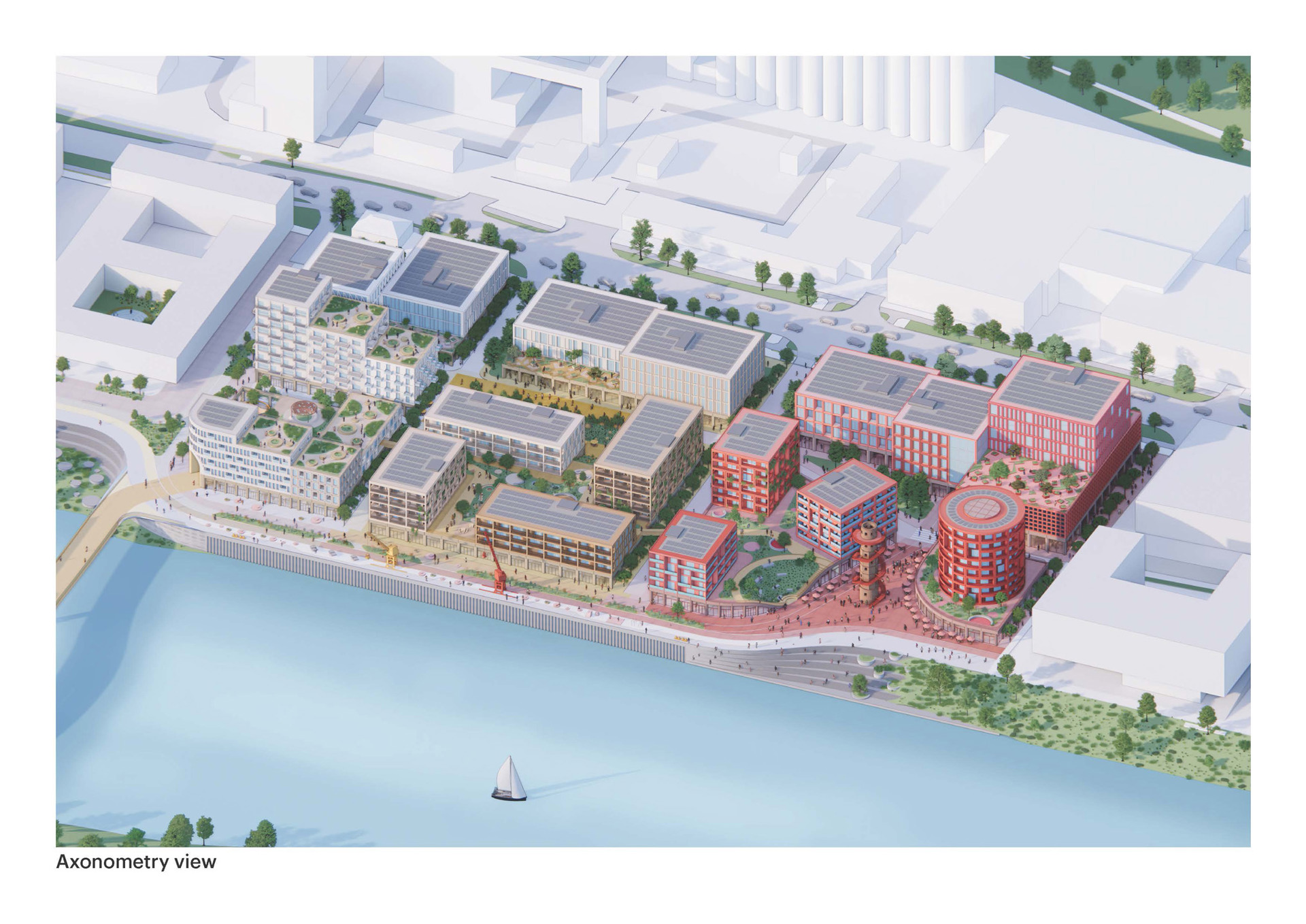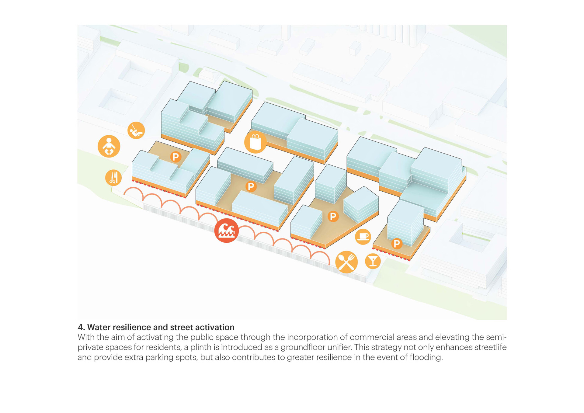 A key element of the proposal are the single-storey plinths that unify each block. With their deep floorplans, these plinths host commercial spaces to enhance street life. In the residential blocks, the plinth roofs become elevated courtyards, with green landscaping that extends the public realm vertically, providing community gardens and recreation areas for residents. Three of the blocks are connected by bridges, allowing movement across the site on multiple levels and re-establishing the continuous green route along the riverbank that is interrupted by the site’s quay wall. To provide access to this upper route, a staircase rises through a grand archway on the eastern end, while on the western end, a tribune staircase doubles as a grandstand for summer performances in the plaza below.