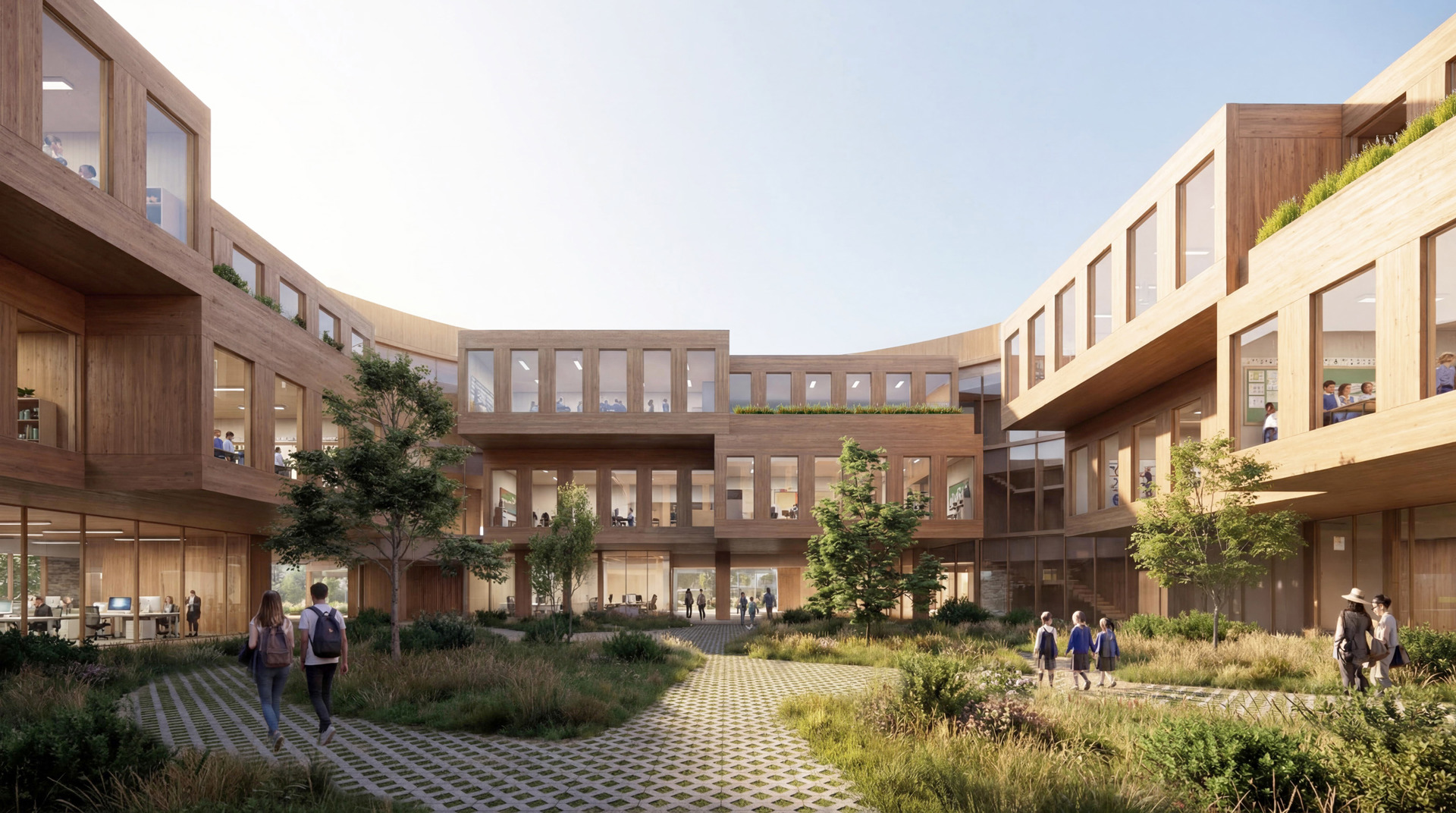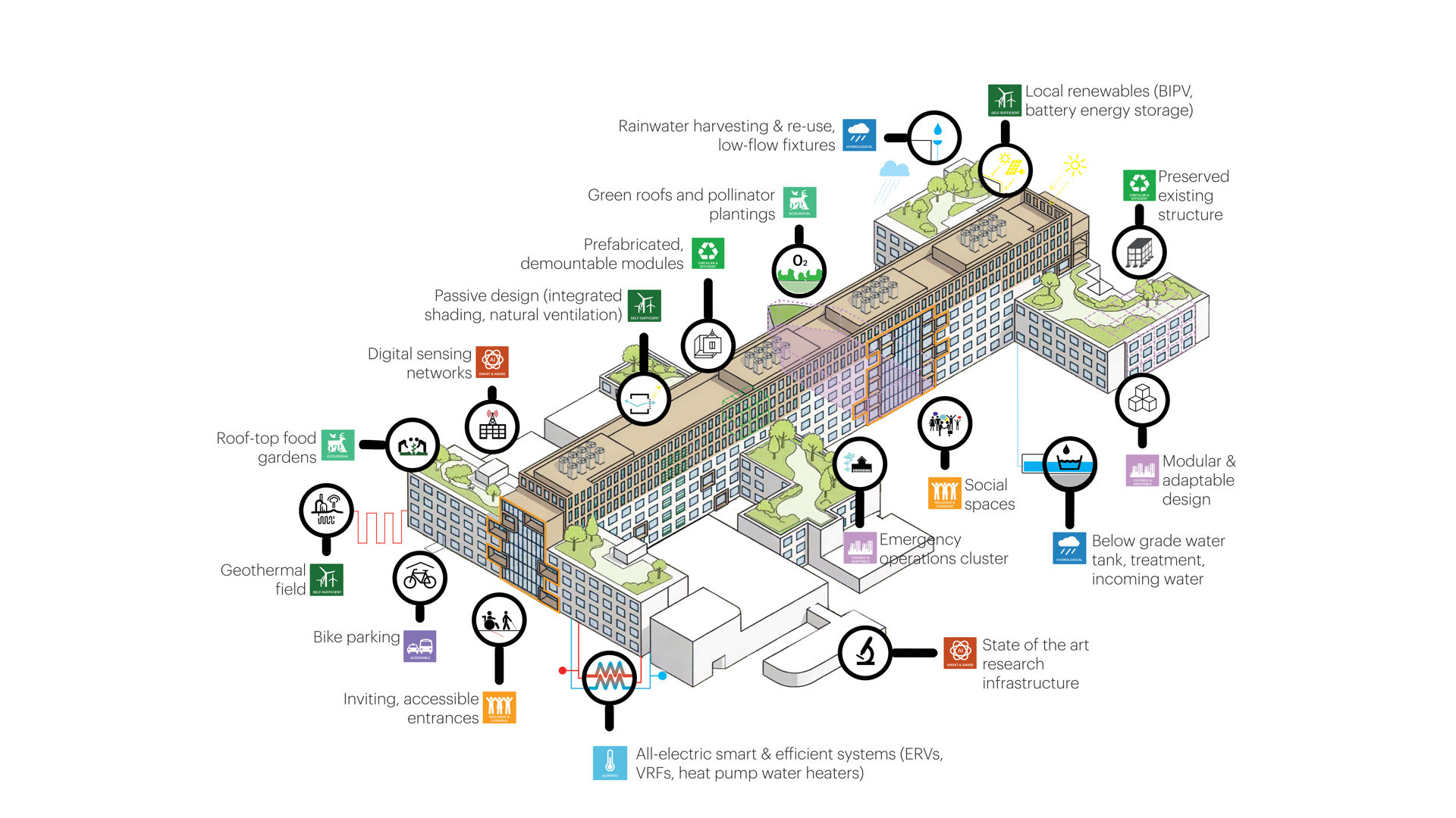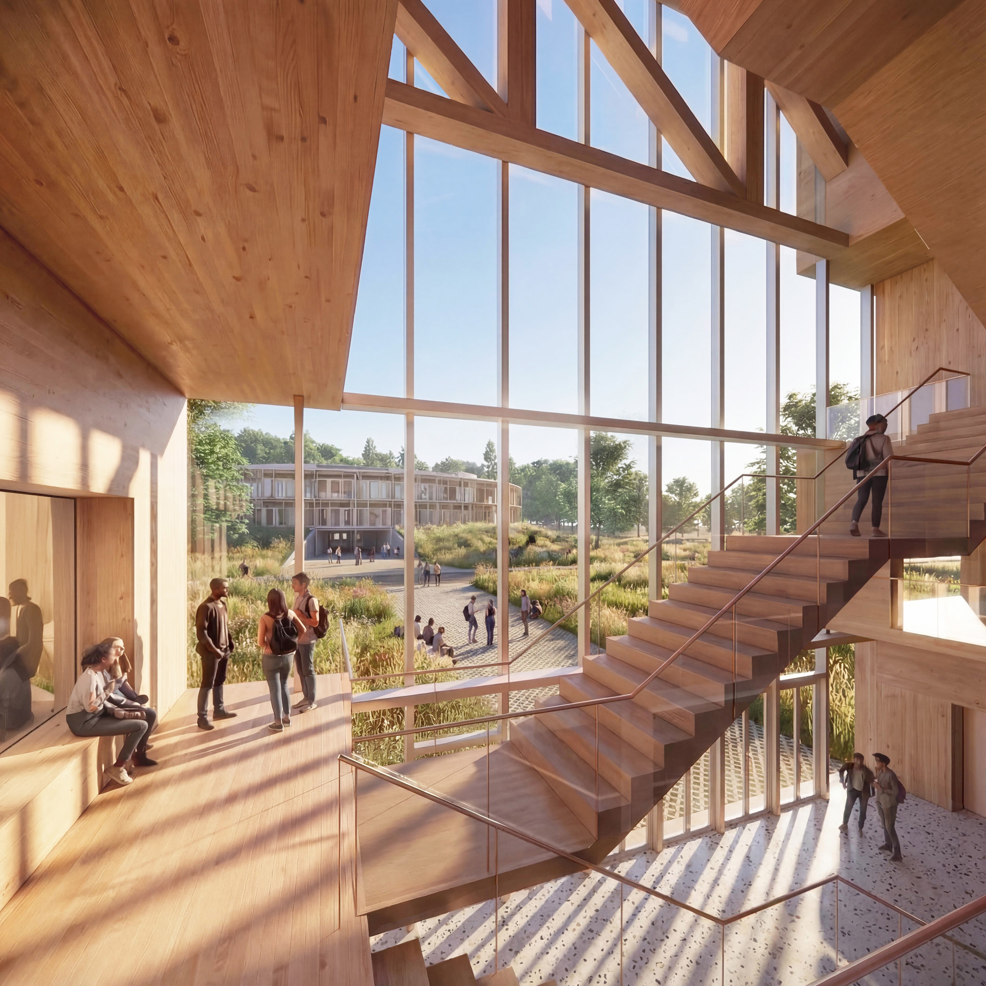 At the scale of individual buildings, the design team proposed to adapt the Health Sciences Complex, clarifying its layout while maintaining the existing structure. A series of atriums are carved into the building at strategic locations, creating vibrant social spaces, while flexible classrooms are designed to pivot to become emergency support hubs when required, embedding civic resilience into the campus fabric. A lightweight, modular timber roof extension is proposed as a way to expand the existing building without encroaching upon the campus landscape and without requiring reinforcement of the existing structure, thus providing a low-impact approach to increase the building’s capacity for the coming decades.
