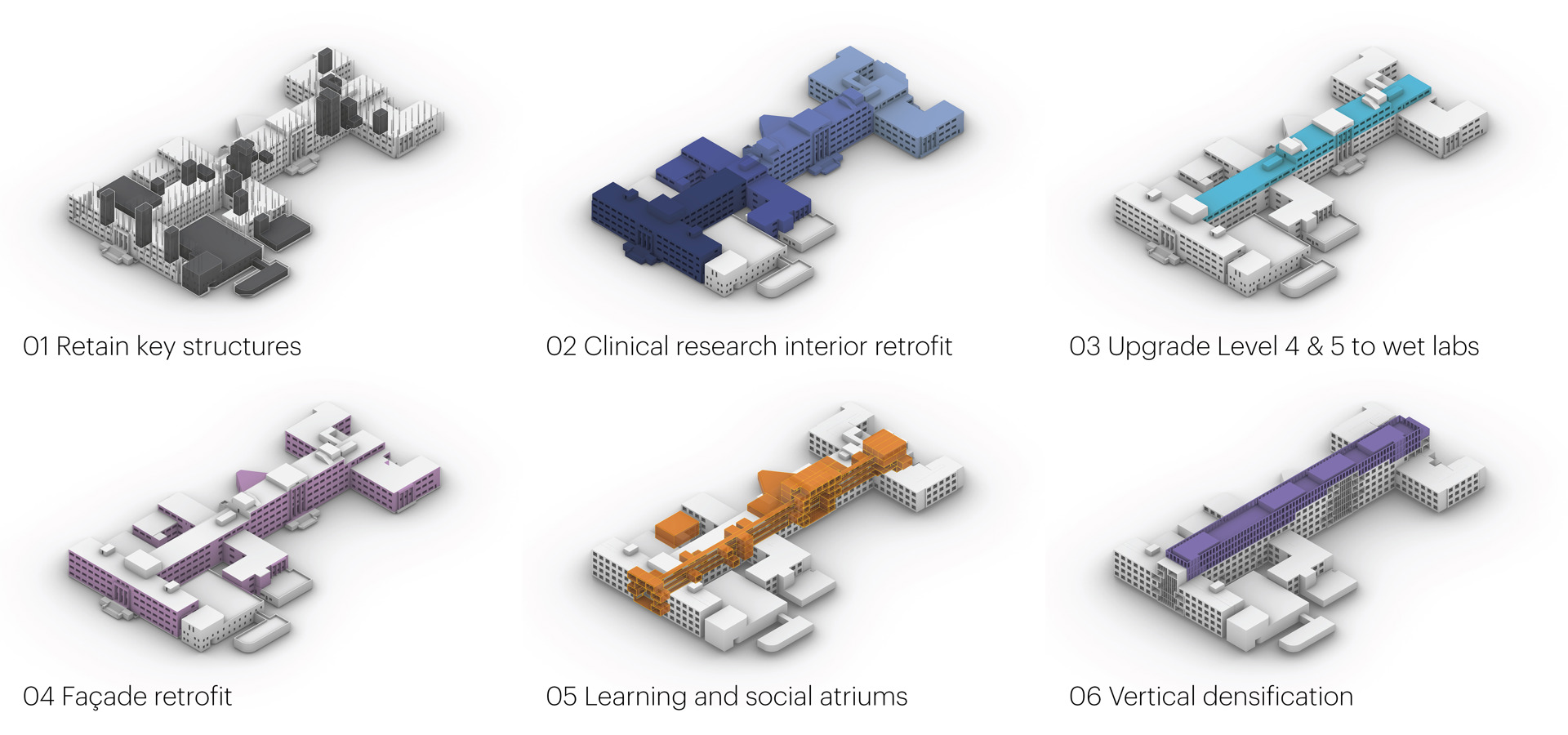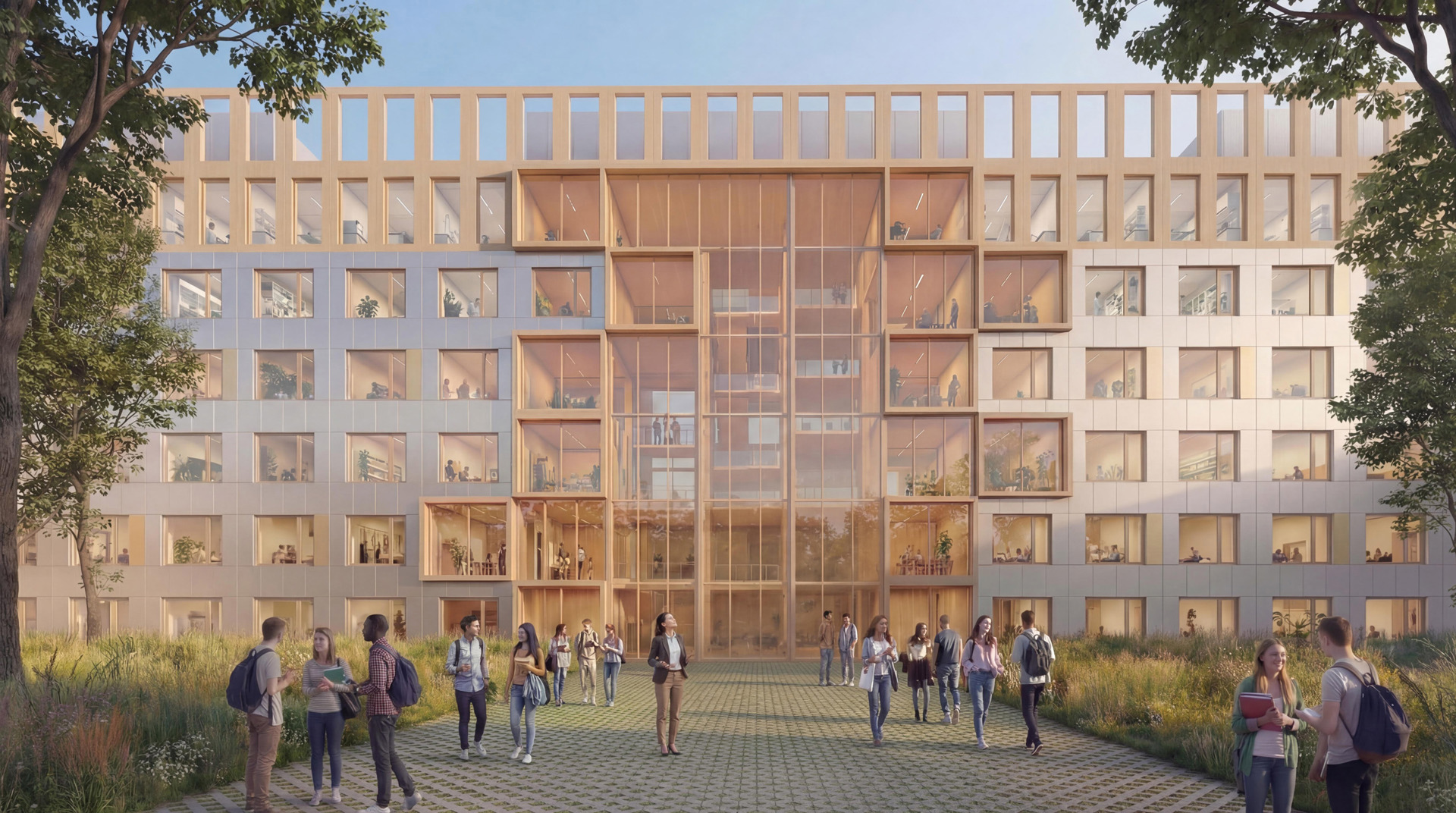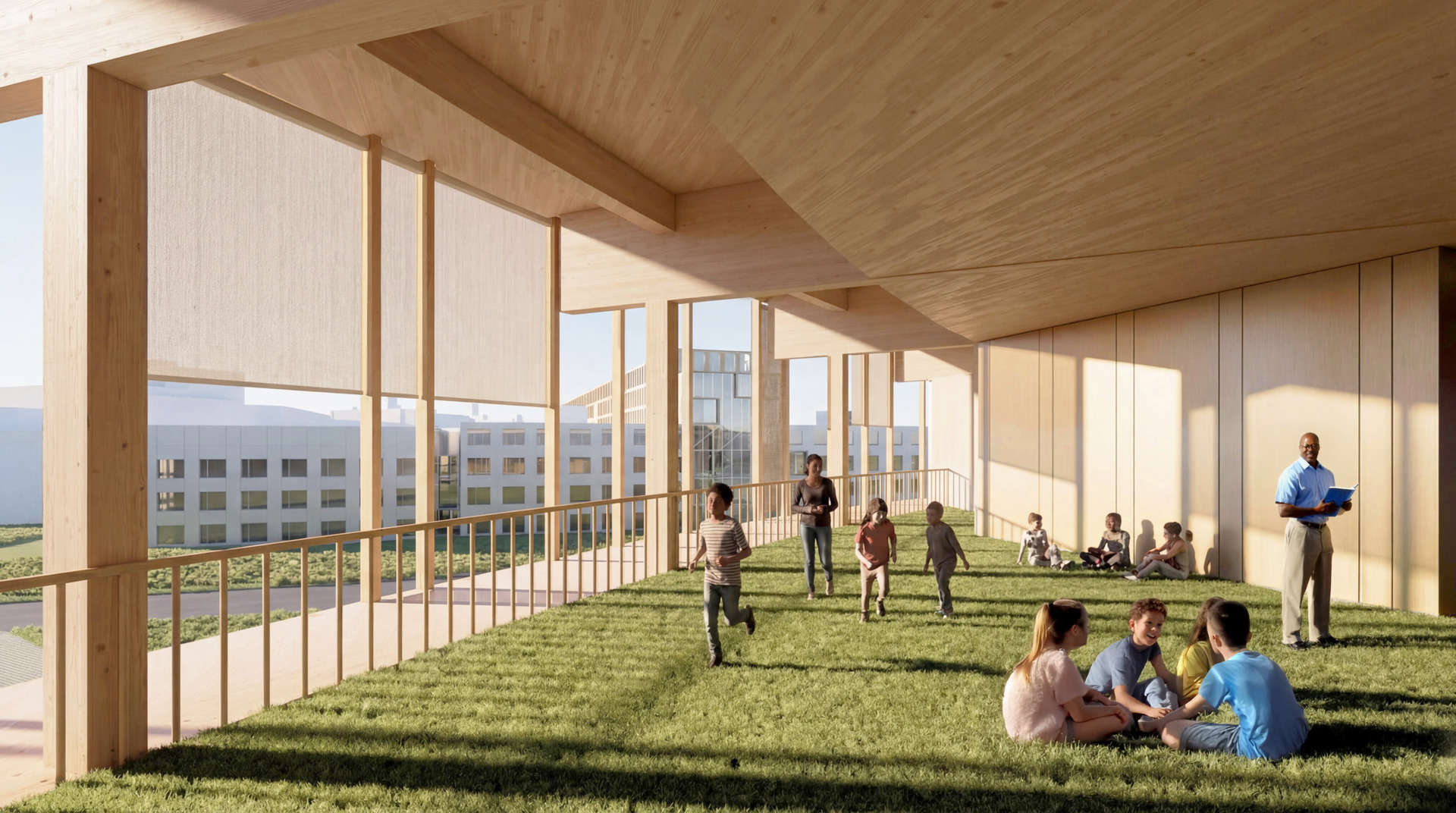 At the scale of individual buildings, the design team proposed to adapt the Health Sciences Complex, clarifying its layout while maintaining the existing structure. A series of atriums are carved into the building at strategic locations, creating vibrant social spaces, while flexible classrooms are designed to pivot to become emergency support hubs when required, embedding civic resilience into the campus fabric. A lightweight, modular timber roof extension is proposed as a way to expand the existing building without encroaching upon the campus landscape and without requiring reinforcement of the existing structure, thus providing a low-impact approach to increase the building’s capacity for the coming decades.