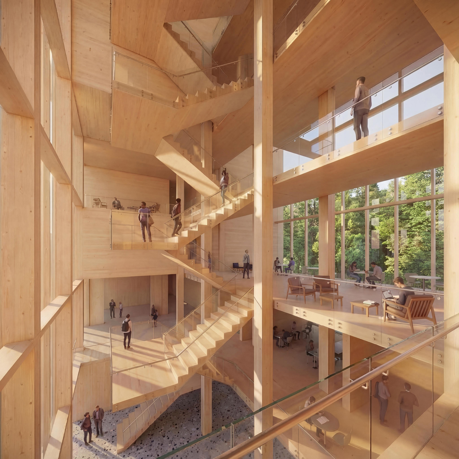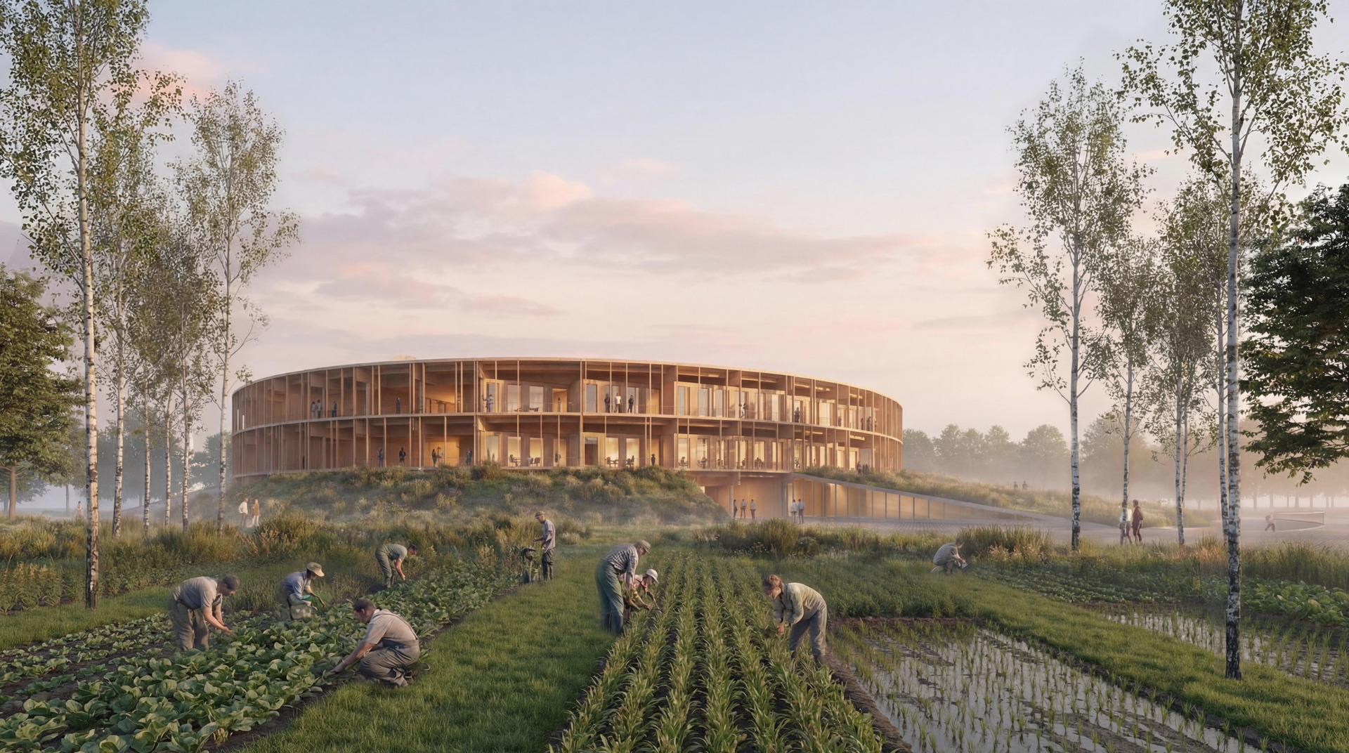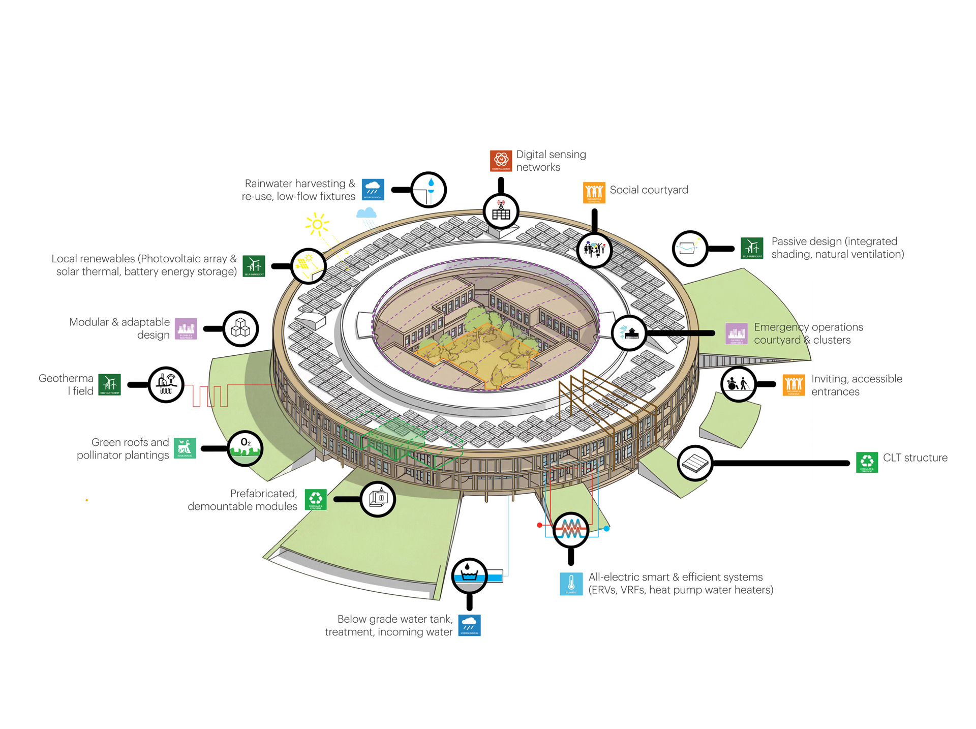 The new building for the university-assisted public school, meanwhile, is envisioned as a way to integrate the university with the broader community, strengthening community-based resilience. The circular building has a welcoming ground floor, set into the landscape yet porous and open to its surroundings, with a central courtyard that functions as a communal gathering space. The flexible and demountable mass timber design, along with renewable energy generation, ensures that the building is low-impact and contributes to the self-sufficiency of the campus.