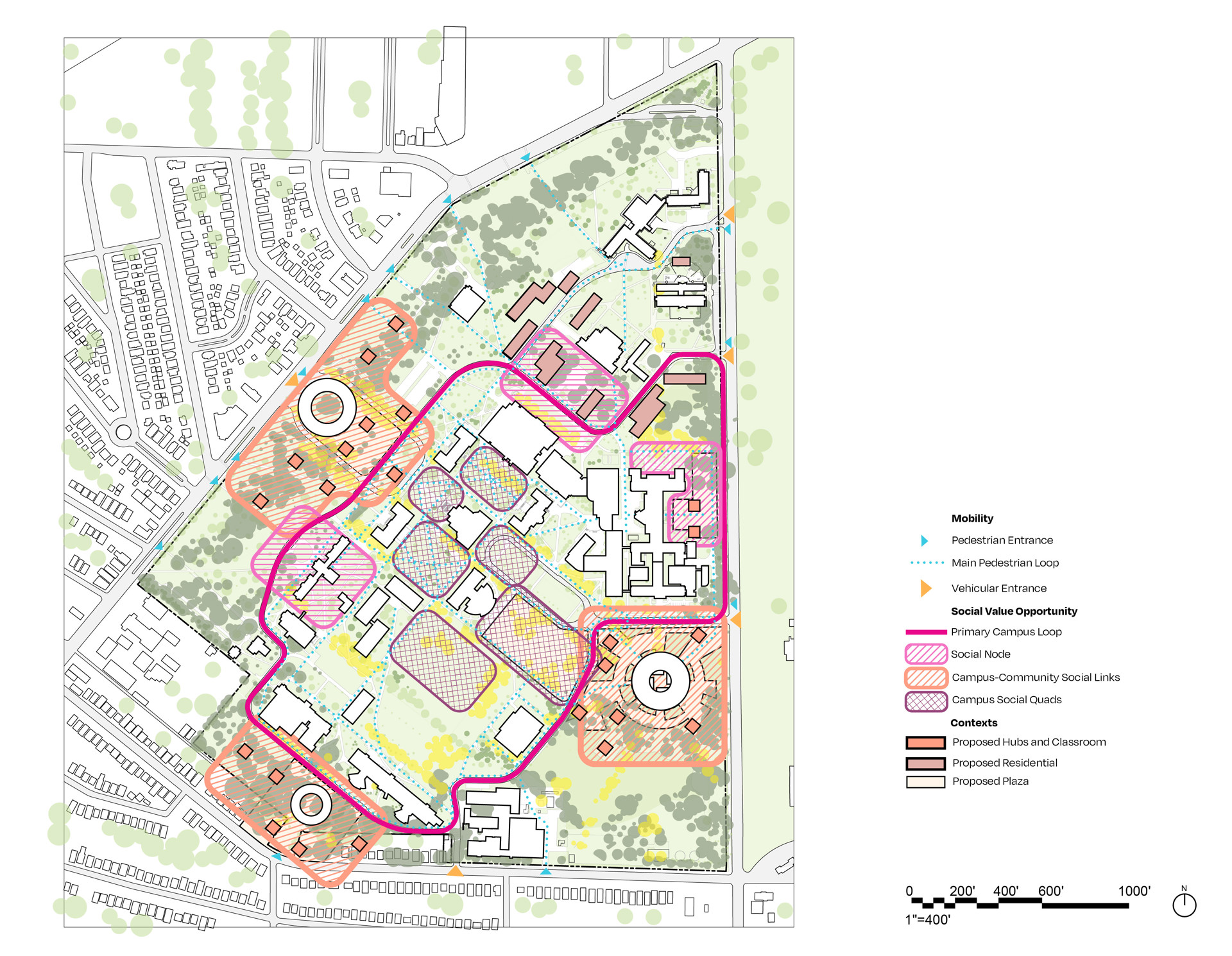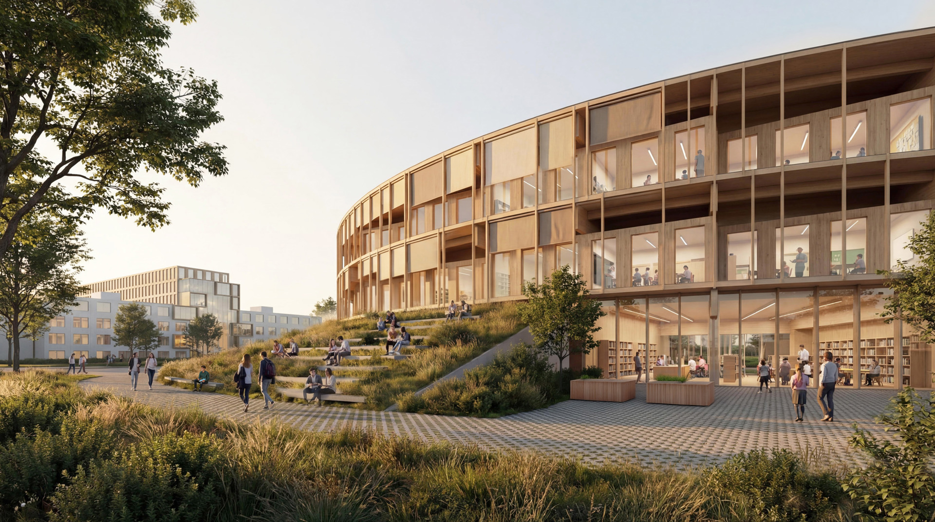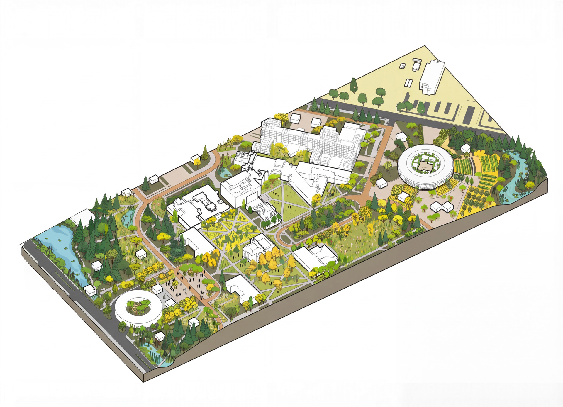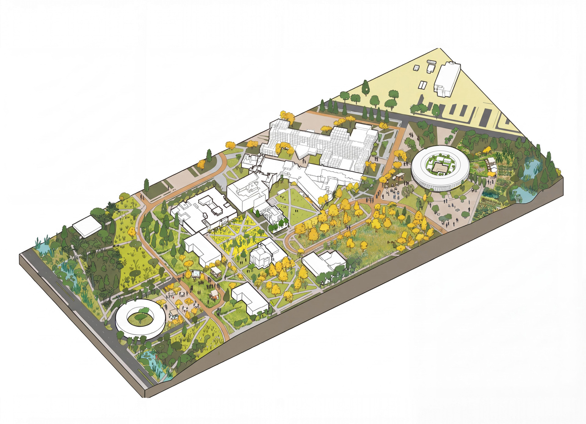 In the 2050 scenario, the team’s prediction of extreme climate effects, combined with climate migration, gave maximum priority to climatic, hydrological, and ecological adaptation, with high emphasis also placed on flexibility, accessibility, and inclusivity. This resulted in interventions including water retention basins along the low-lying eastern limits of the campus, and tree rows that add to biodiversity and serve as natural snow fences during winter. A looping path connects the entire campus as a primary mobility route, connecting a variety of hubs that serve the campus’s many users, from students to neighbourhood residents.