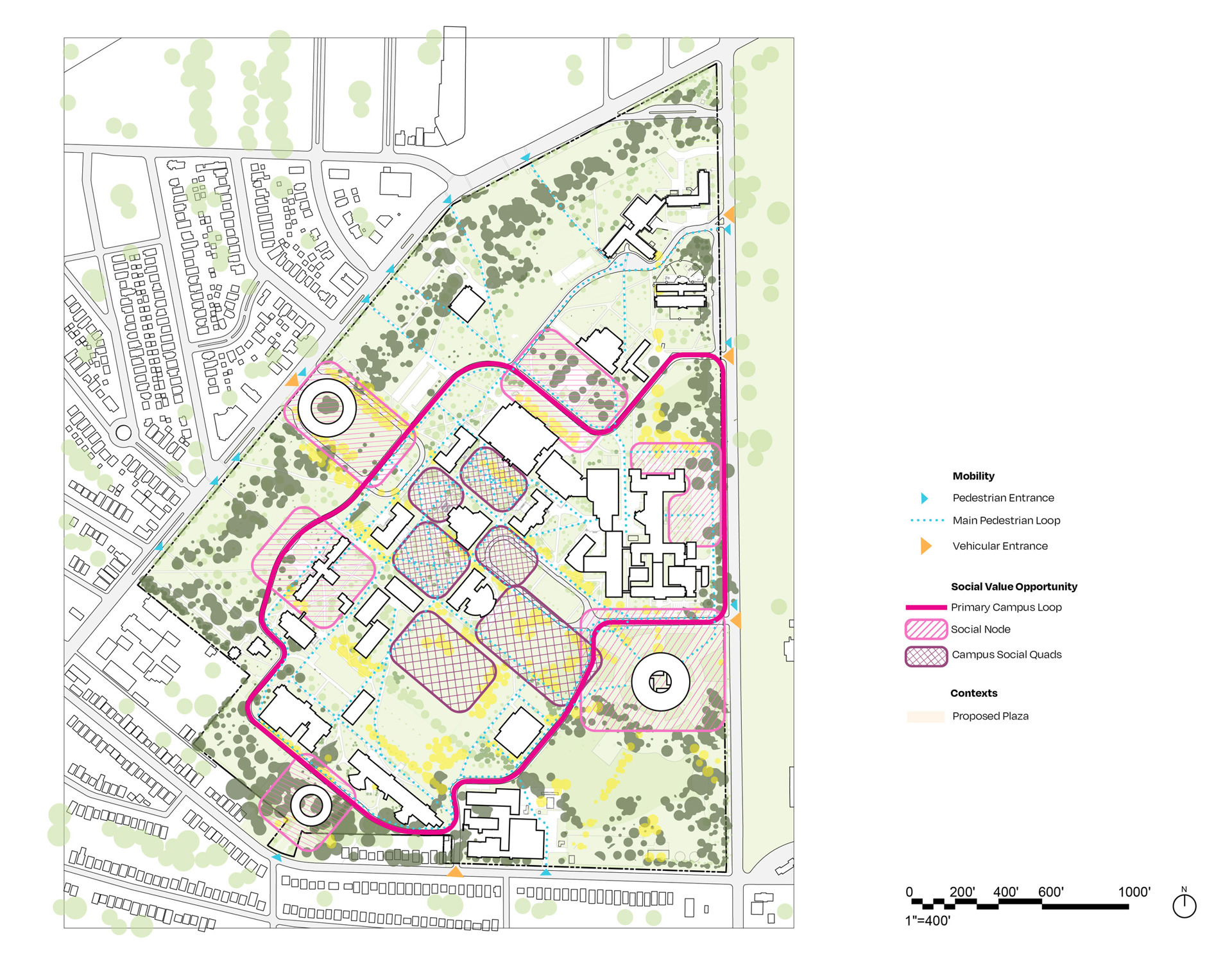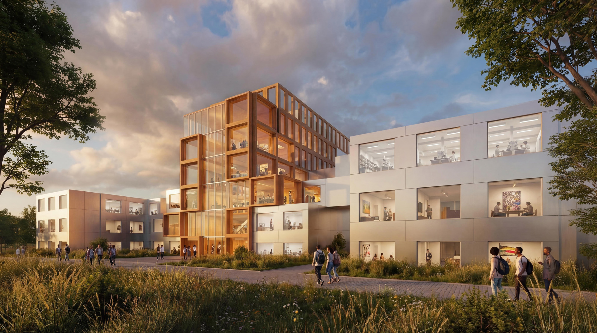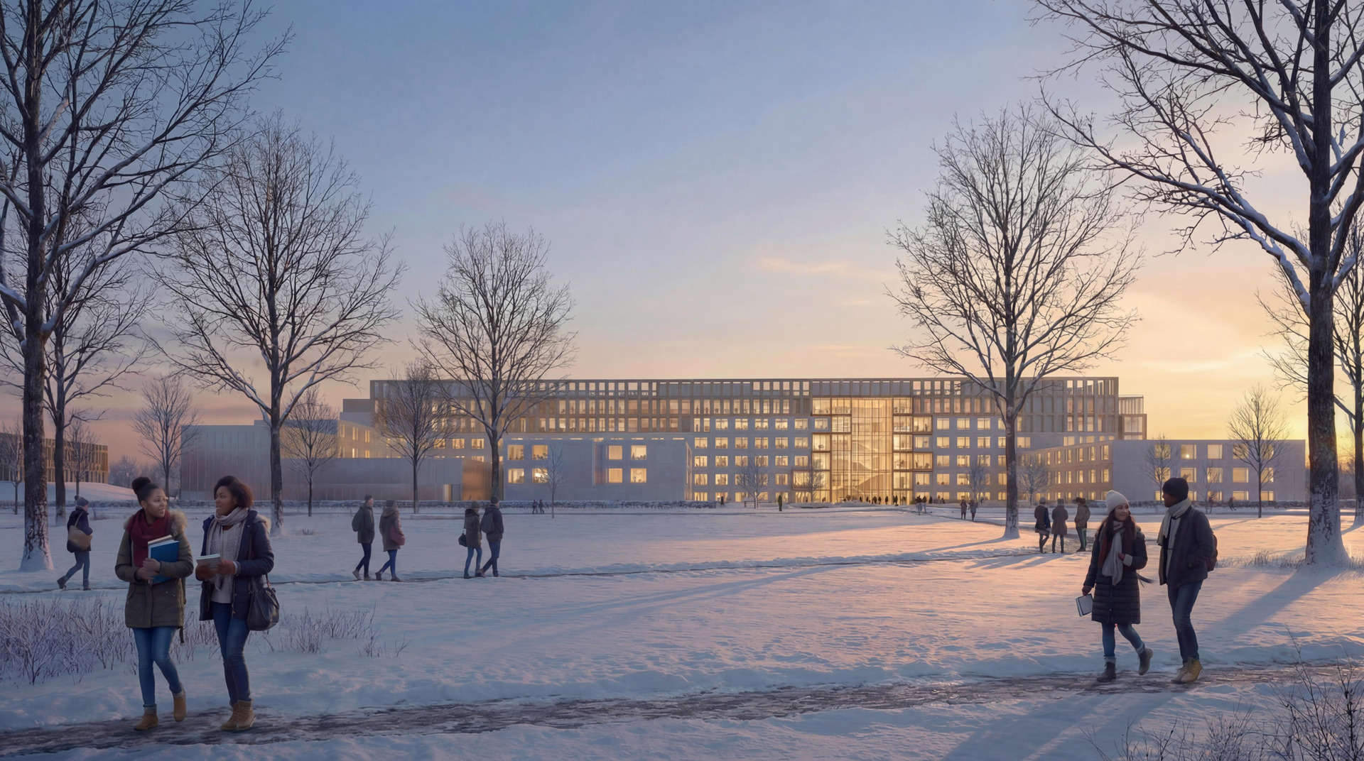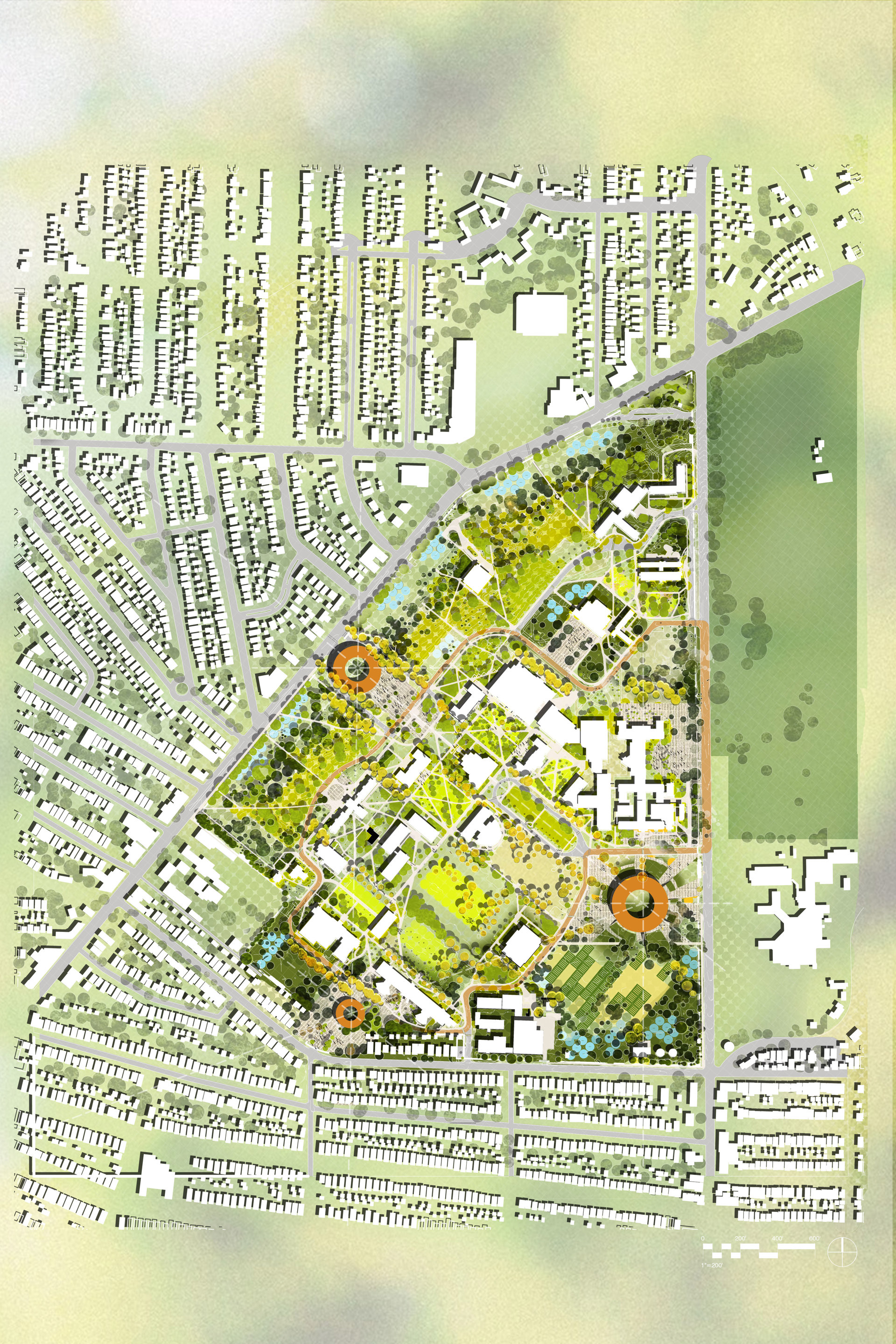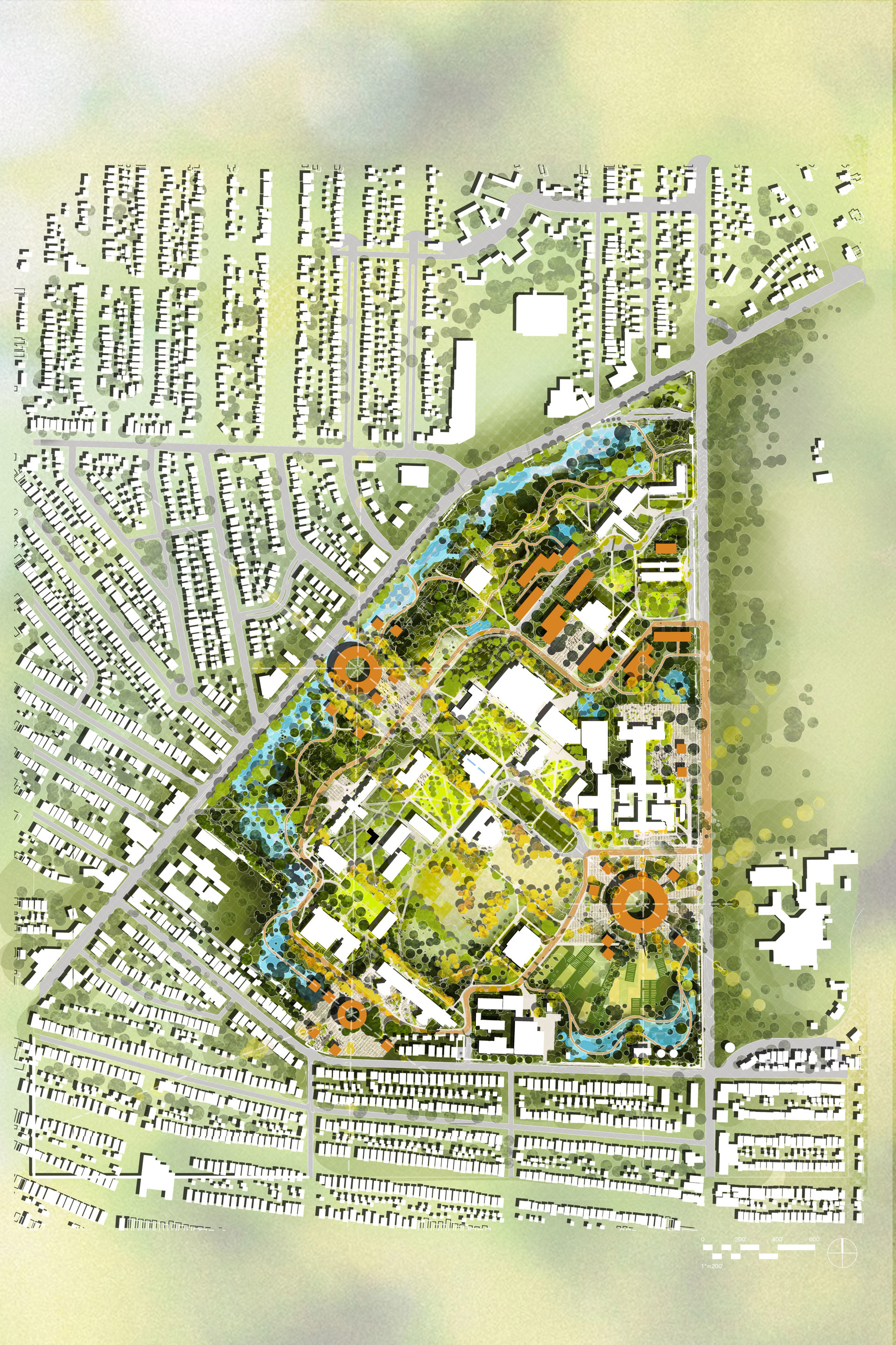 The Resilient Campus Competition asked entrants to envision future scenarios for the University at Buffalo’s South Campus, outlining strategies that would allow the campus to absorb and adapt to the likely challenges of the future, from climate change to demographic shifts. With scenarios presented for two time periods, 2050 and 2080, the brief thus invited designers to show the potential evolution of the campus as the 21st century unfolds. In addition, the competition asked for architectural proposals for two buildings – a transformation of the existing Health Sciences Complex and a newly built University-Assisted Public School – allowing the designers to zoom in on how changes to the campus will unfold on a tangible human scale.