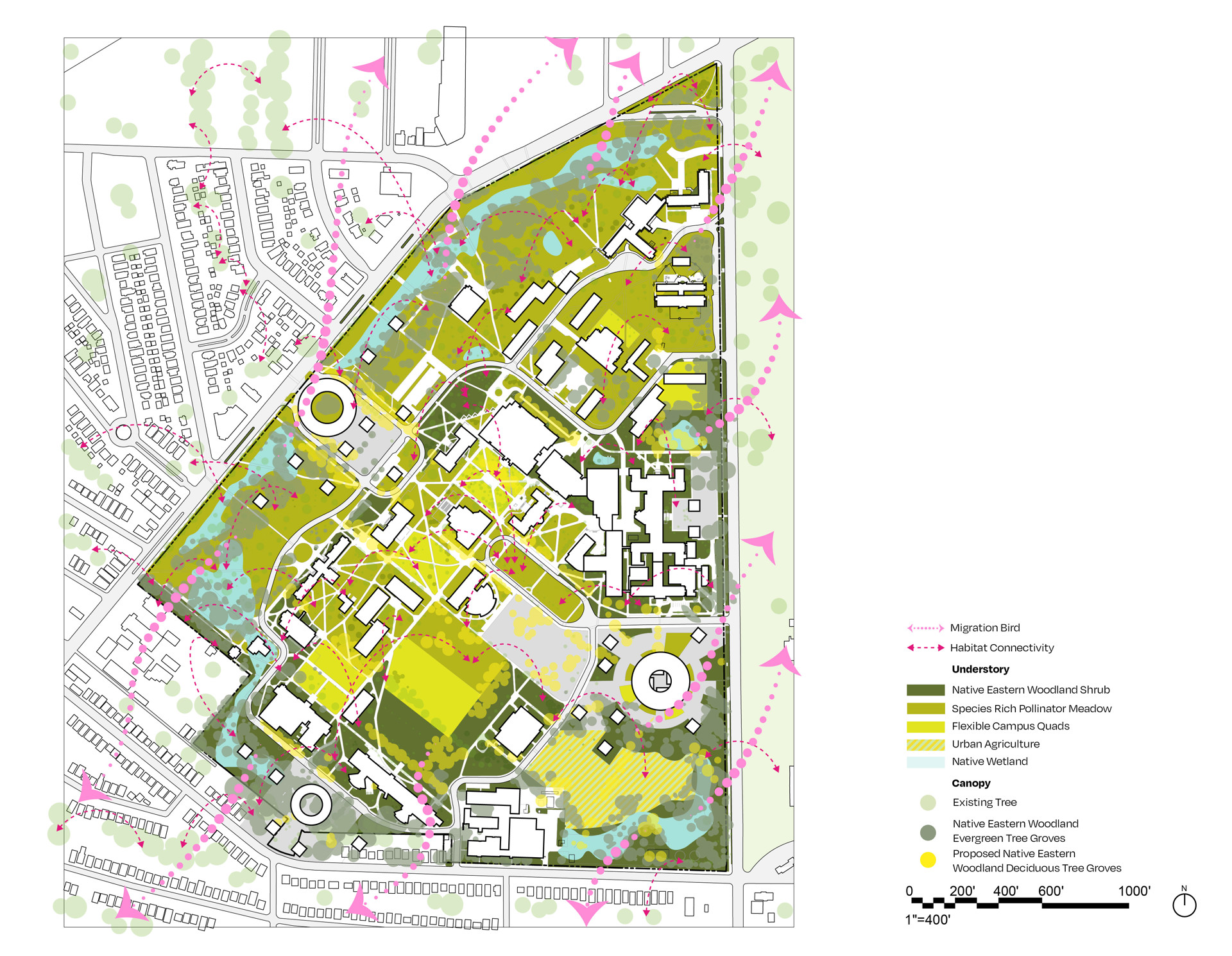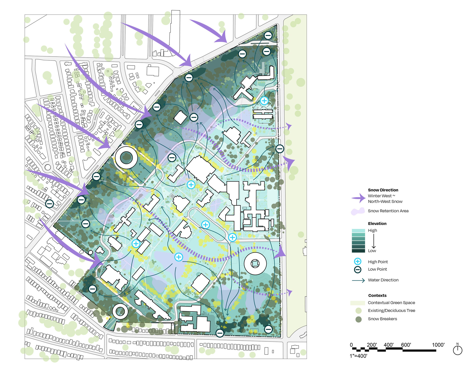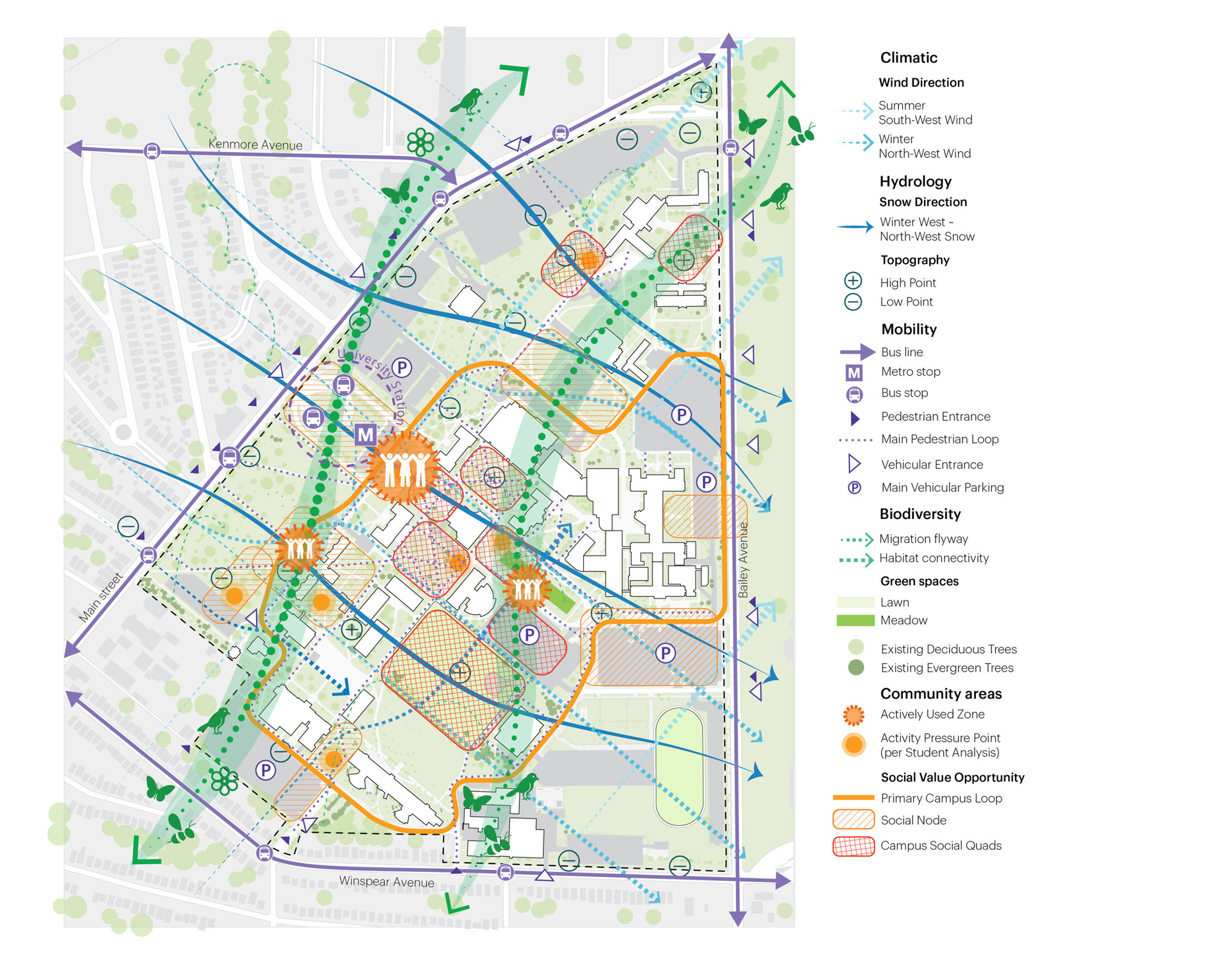 How can we update the classical American university campus, typically designed following the principle of man-made-order, for a new era of resilience and harmony with nature? In the Resilient Campus Competition, organised by the University at Buffalo’s School of Architecture and Planning, MVRDV proposed a data-driven approach that bridges the gap between in-depth site analysis, forecasts of future challenges, and strategic decision-making by campus stakeholders.