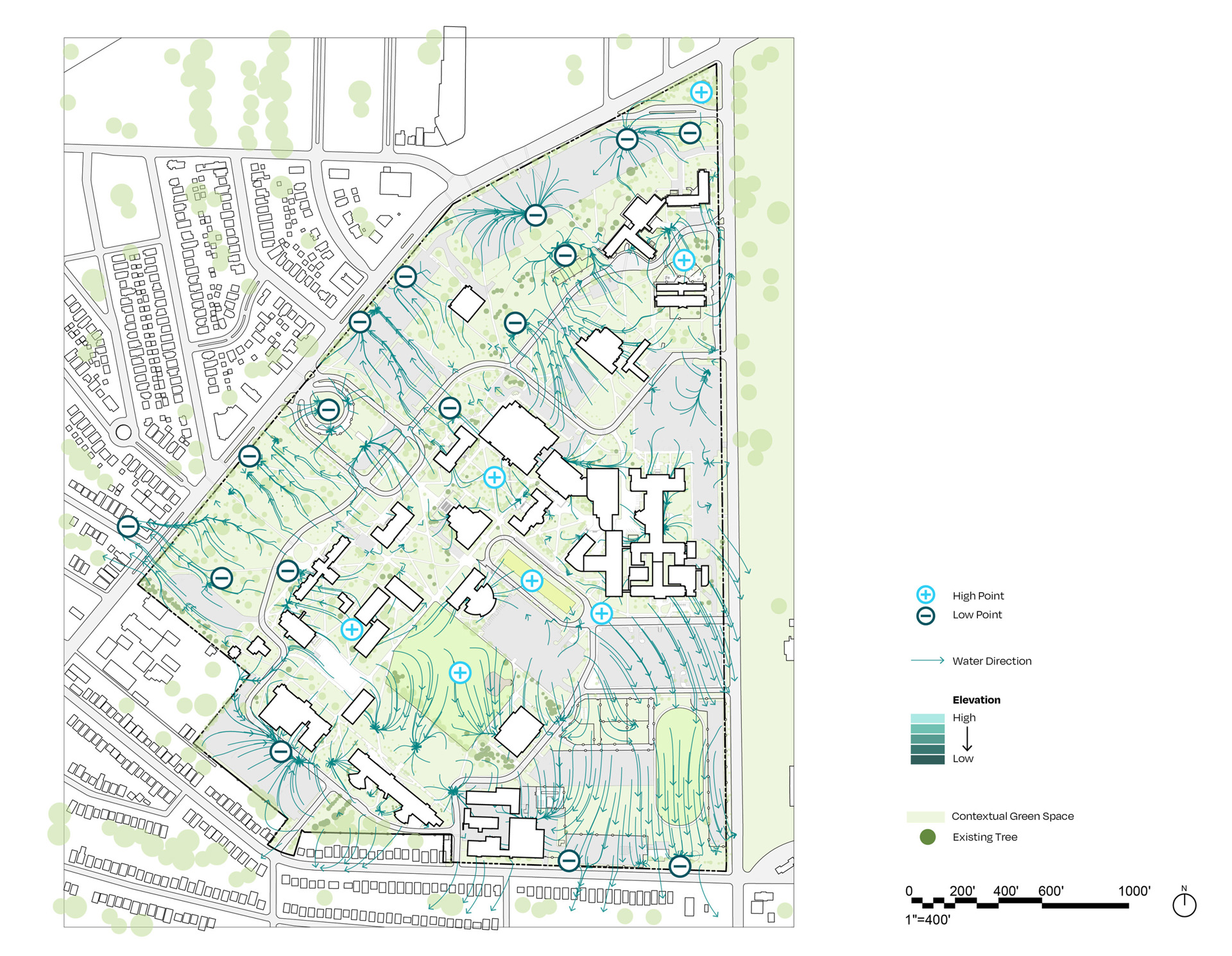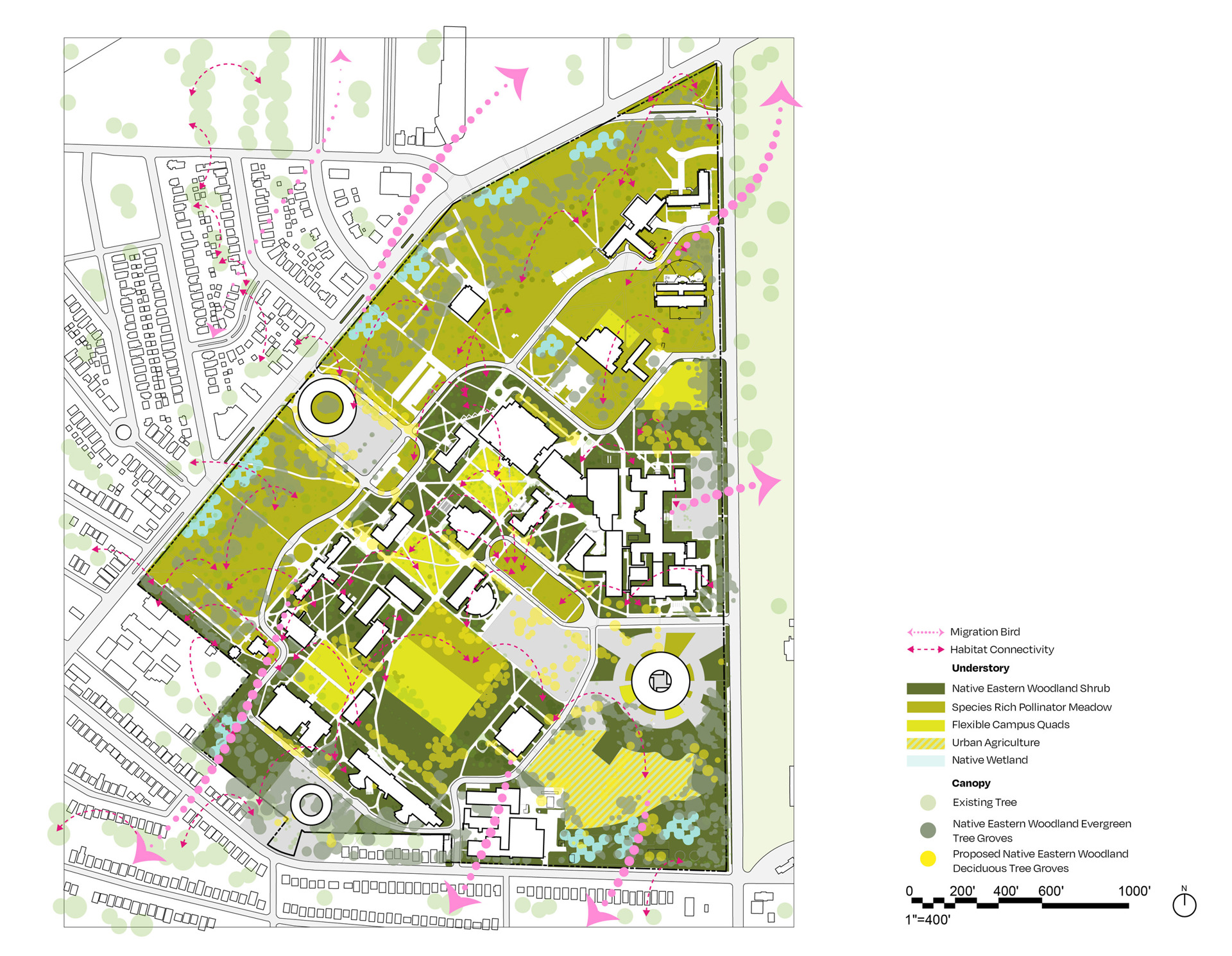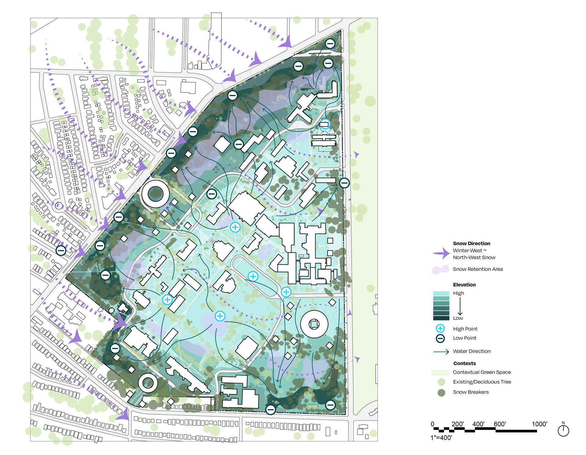 How can we update the classical American university campus, typically designed following the principle of man-made-order, for a new era of resilience and harmony with nature? In the Resilient Campus Competition, organised by the University at Buffalo’s School of Architecture and Planning, MVRDV proposed a data-driven approach that bridges the gap between in-depth site analysis, forecasts of future challenges, and strategic decision-making by campus stakeholders.