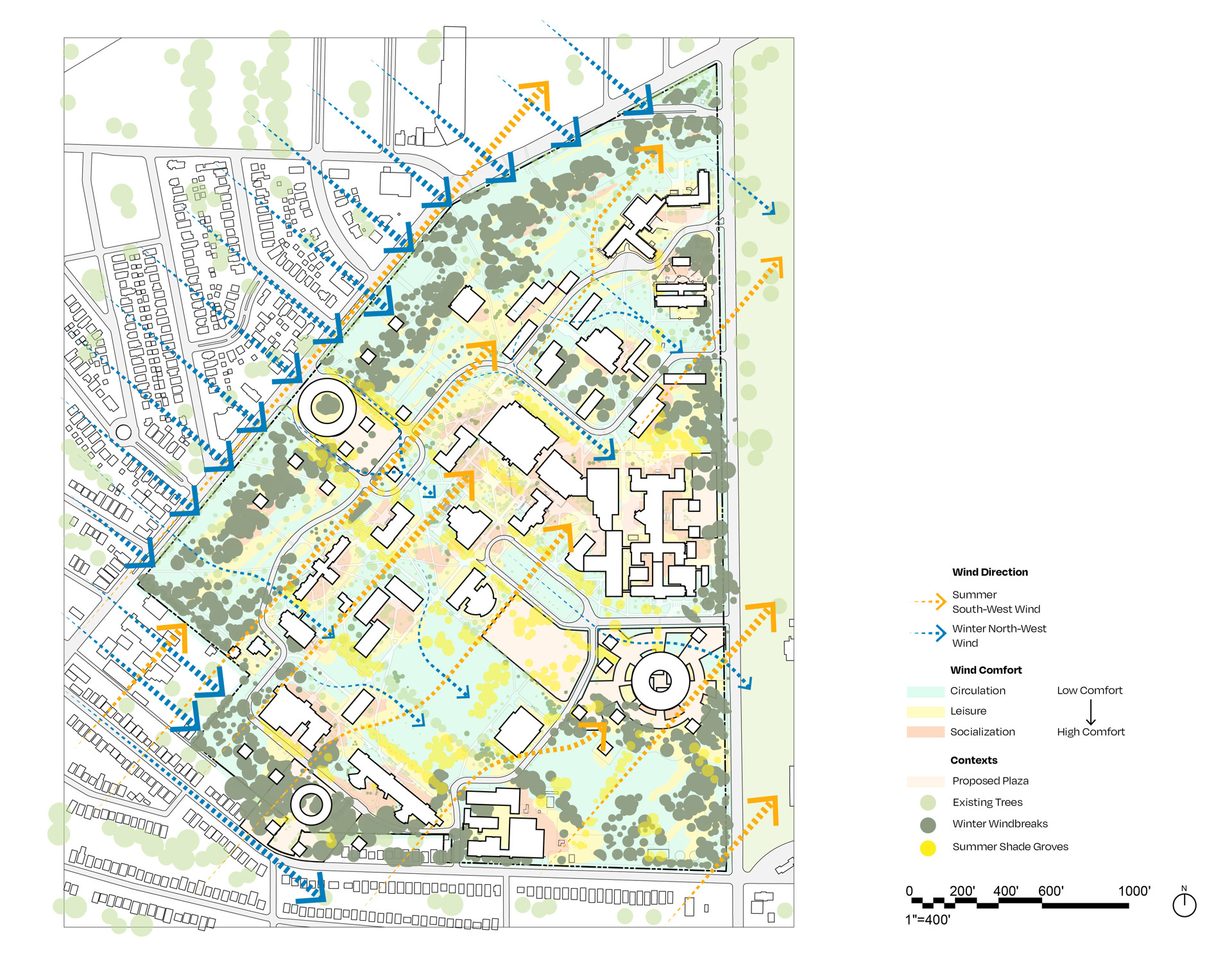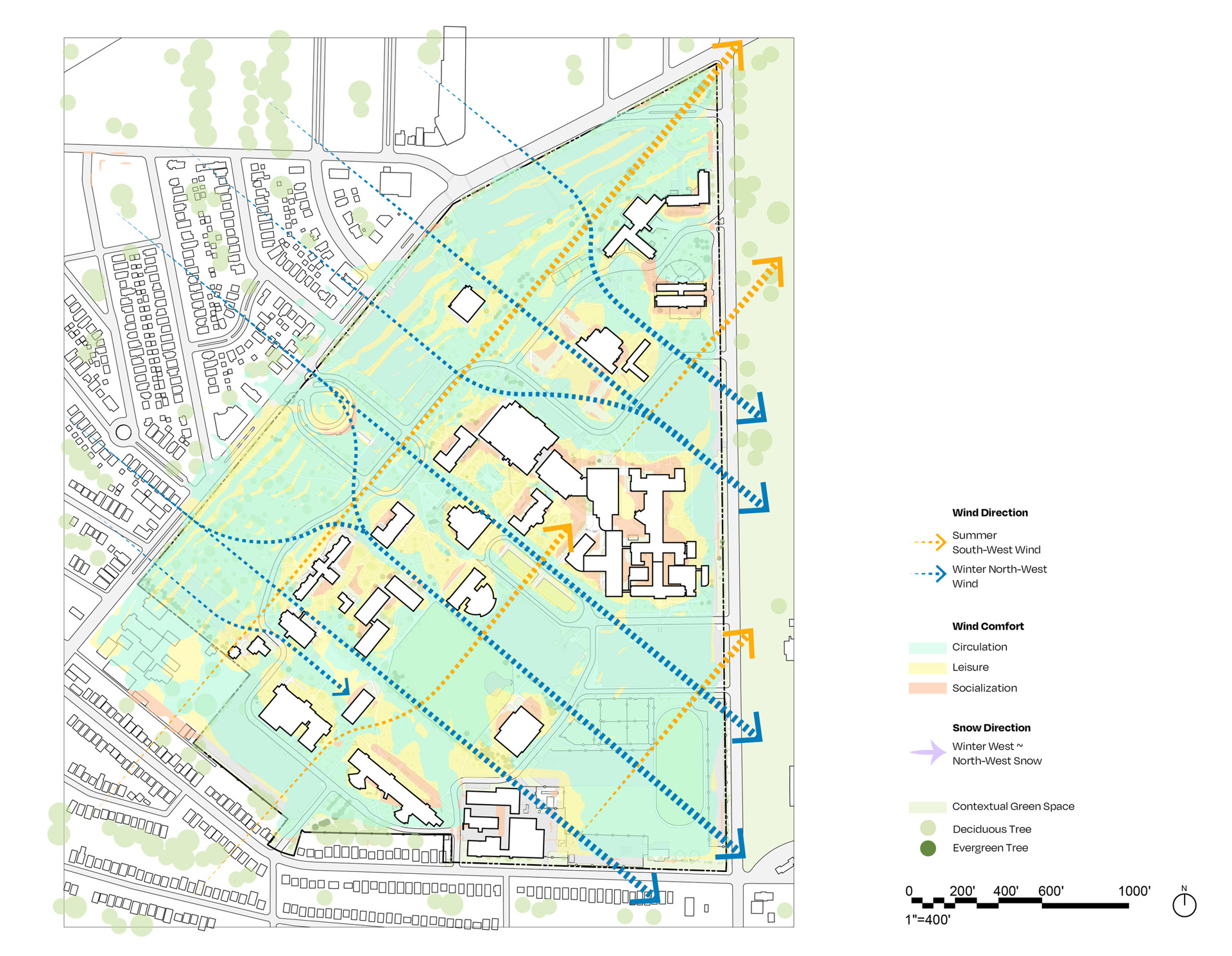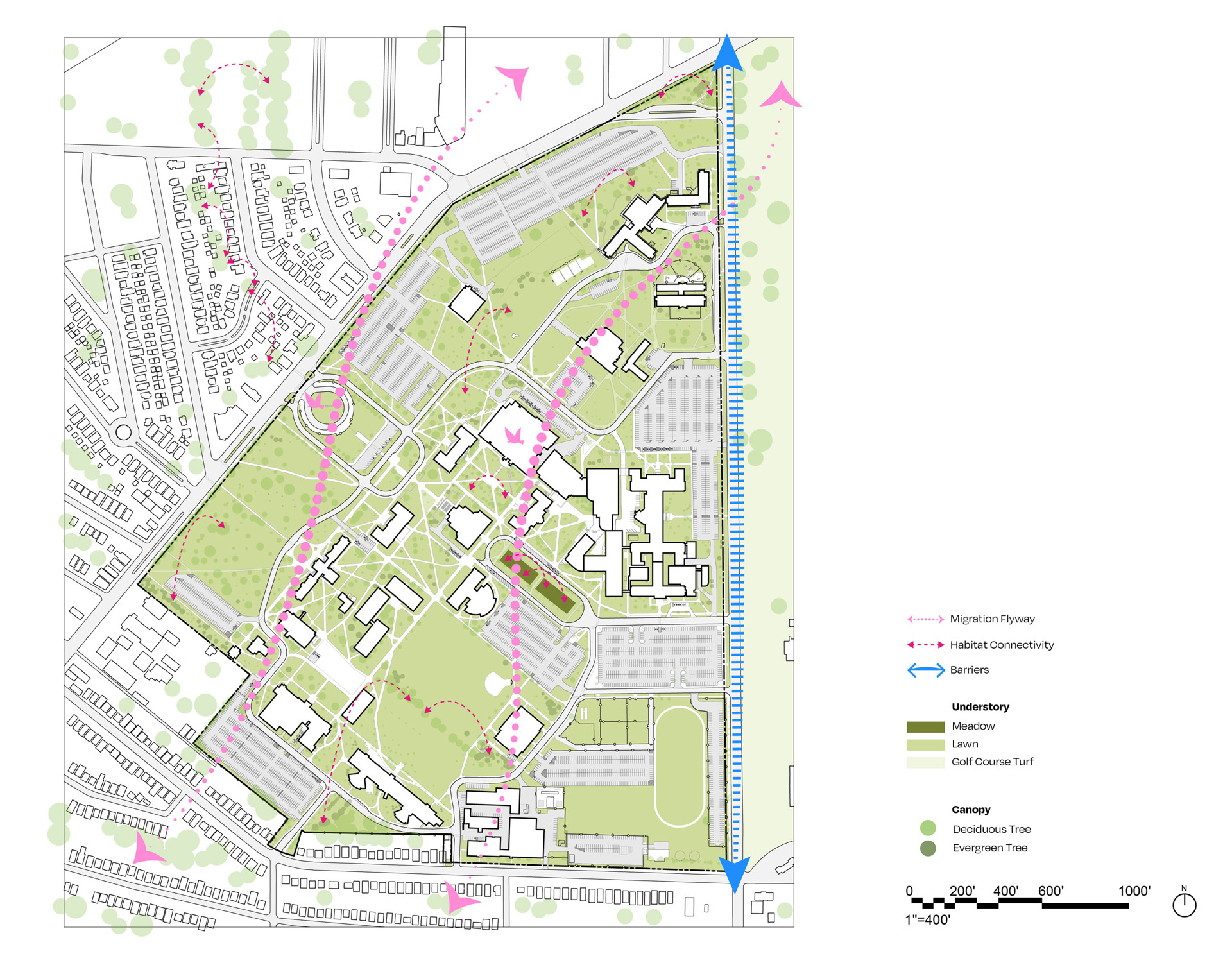 In 2080, many of the scenario predictions are intensified, leading to a more prominent role for the elements such as water retention basins that already arose in 2050. Buffalo’s expanding population, driven by climate migration, is accommodated in new structures that infill some of the campus’s less productive spaces, with a web of new paths contributing to increased interconnectivity. In the 30 years since 2050, new challenges also loom: food and resource shortages greatly increase the priority given to self-sufficiency and circularity, and the campus responds with areas for food production, and flexible, efficient, and demountable building designs.