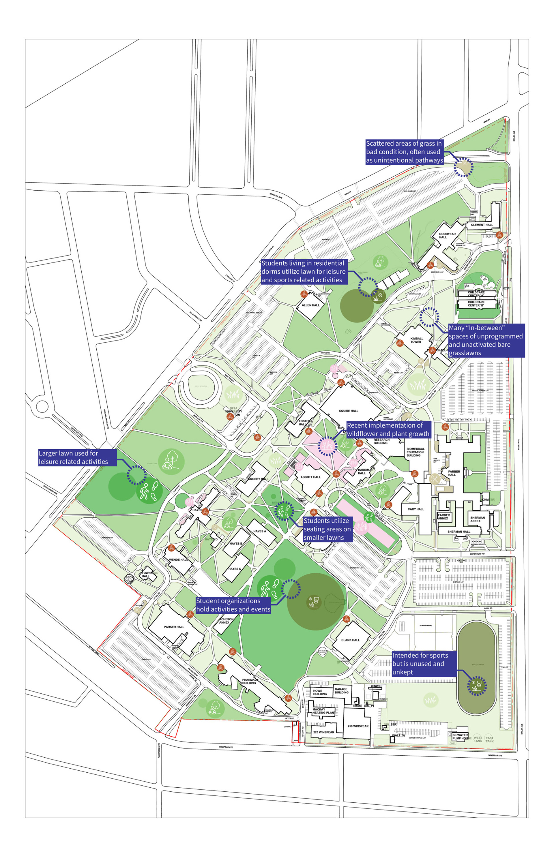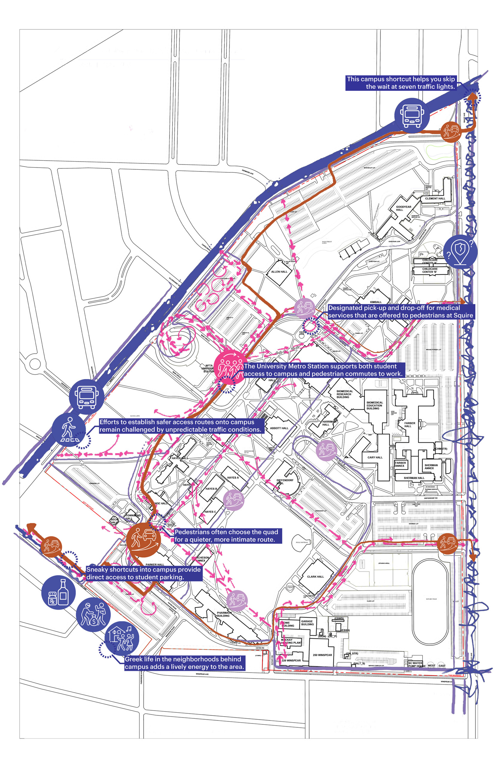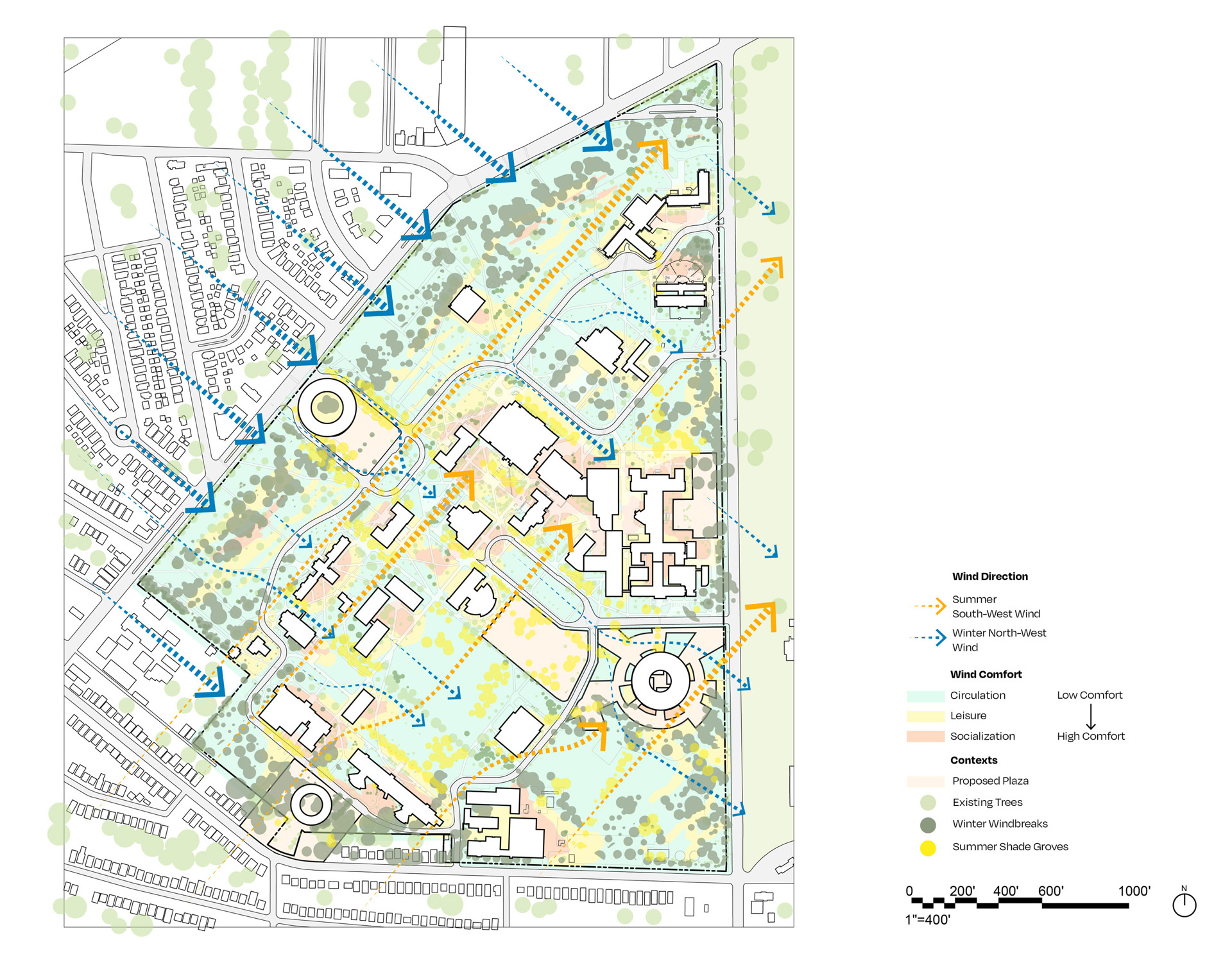 In 2080, many of the scenario predictions are intensified, leading to a more prominent role for the elements such as water retention basins that already arose in 2050. Buffalo’s expanding population, driven by climate migration, is accommodated in new structures that infill some of the campus’s less productive spaces, with a web of new paths contributing to increased interconnectivity. In the 30 years since 2050, new challenges also loom: food and resource shortages greatly increase the priority given to self-sufficiency and circularity, and the campus responds with areas for food production, and flexible, efficient, and demountable building designs.