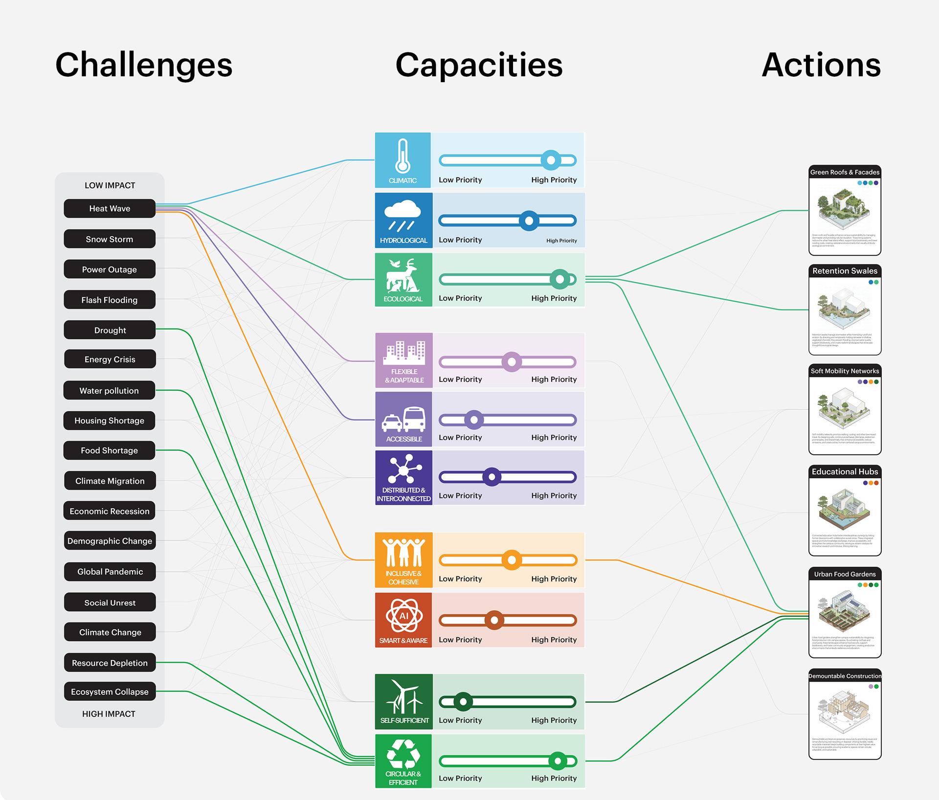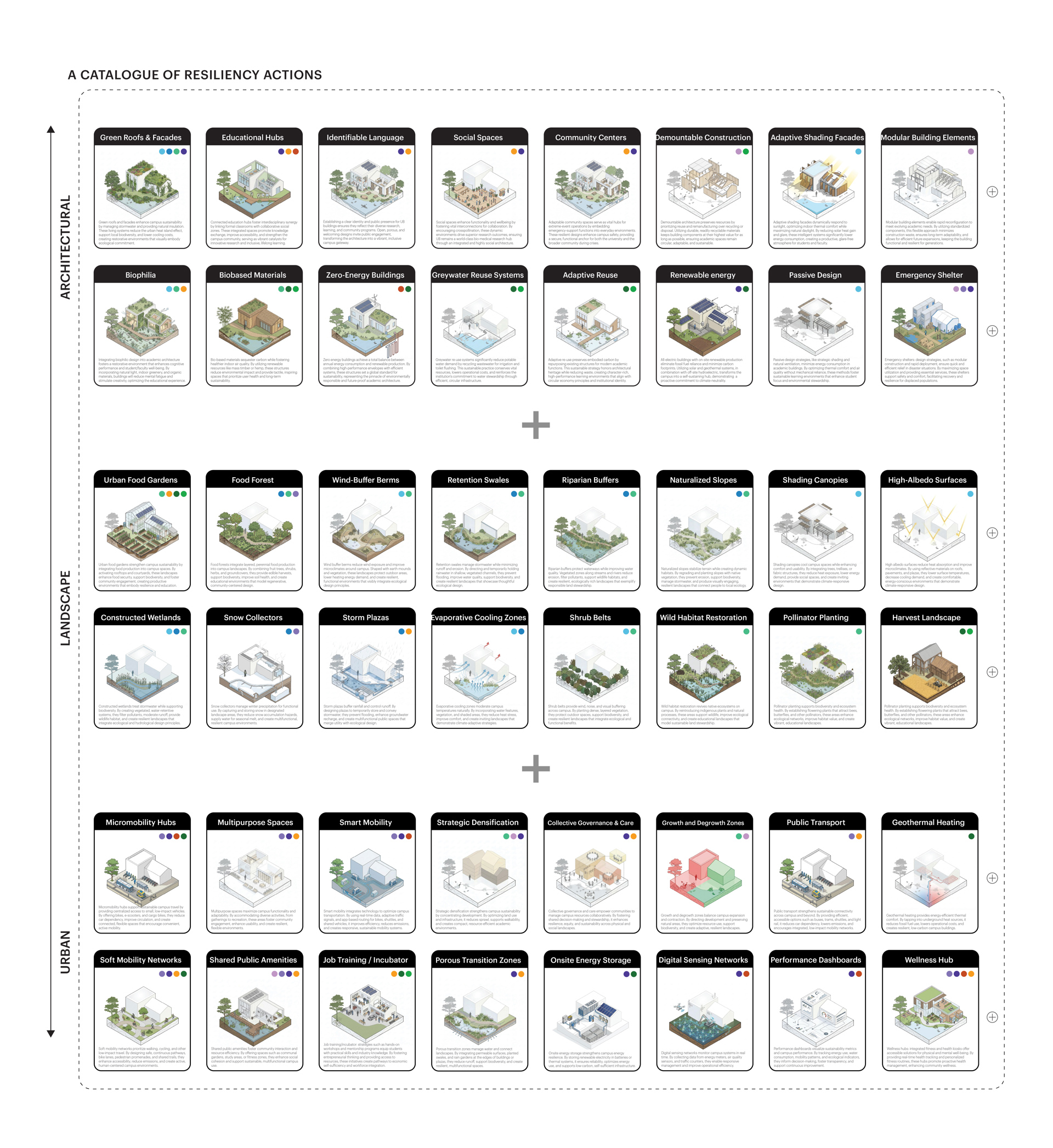 The next element of the methodology is the resilience matrix, which allows the designers to map out future scenarios. From increased frequency of heatwaves and snowstorms, to economic recession, to demographic changes, the predictions made for a given time in the future feed into priority sliders for the campus: whether the design should focus on topics such as ecology, hydrology, flexibility, accessibility, self-sufficiency, and more. Finally, these priorities are linked to a catalogue of design features that improve various aspects of resilience, with design recommendations overlaid onto the coordinates of the map by an algorithm known as the Weighted Adaptive Transformation Tool (WATT) depending on the potentials identified in the site analyses – thus connecting global challenges to local conditions.