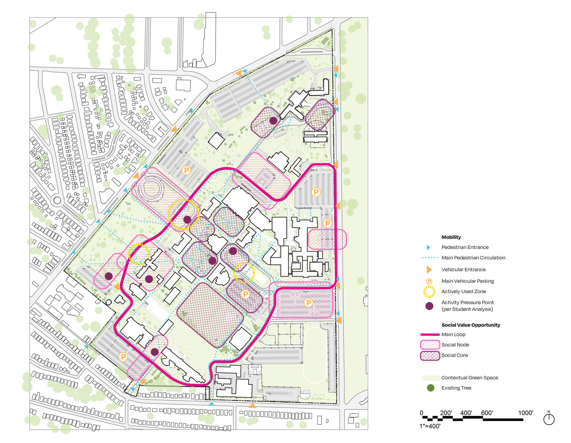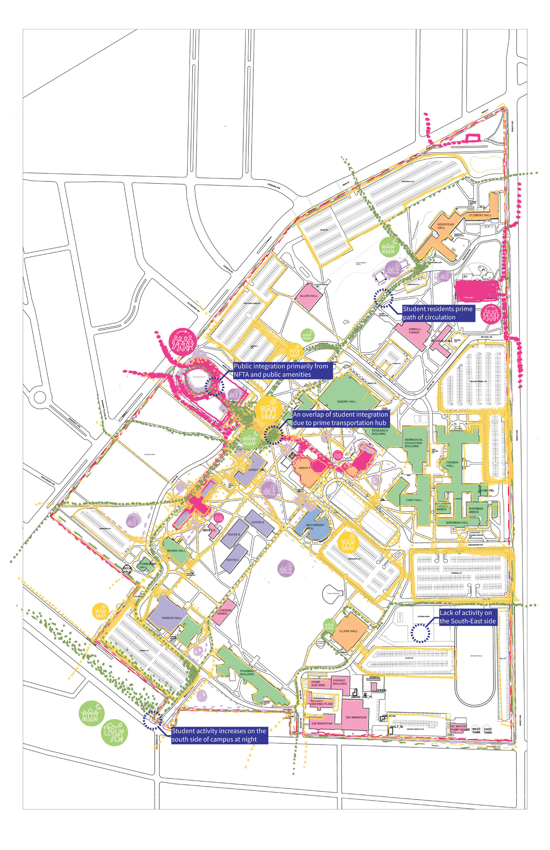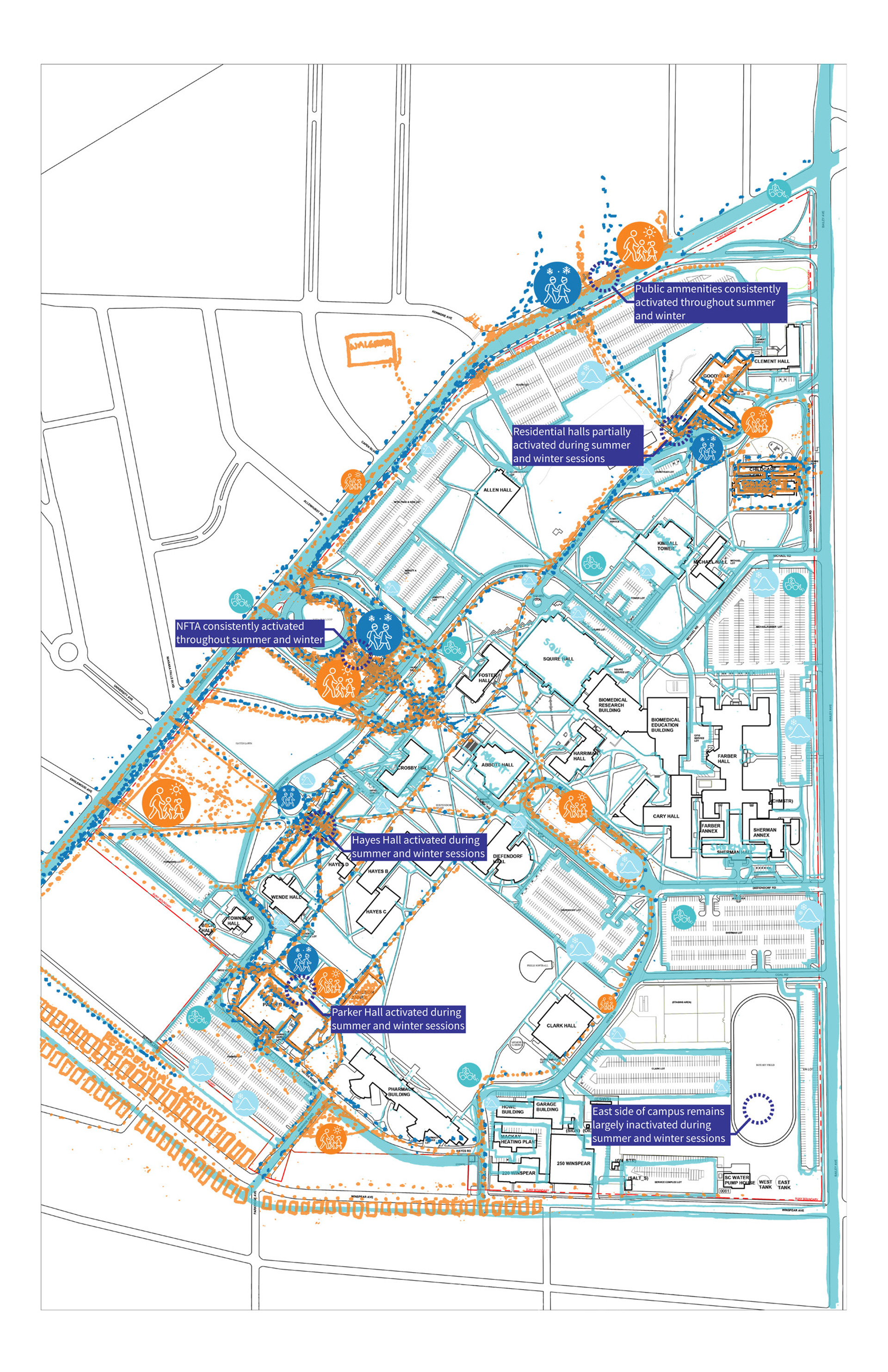 In their response to this brief, MVRDV and RIOS developed a data-based methodology that would allow them to ensure proposals respond to real conditions rather than abstract assumptions. The process involved first collecting a wide variety of site analyses – including technical aspects of the campus such as wind and sunlight patterns, hydrology, ground elevation, and vegetation, but also qualitative analyses contributed by the team’s student assistants, who investigated topics such as where people congregate, which routes they use to move around, and how these patterns change across seasons. These layers of analysis were mapped onto a coordinate system to create a digital spatial model of the current conditions at every location on the campus.