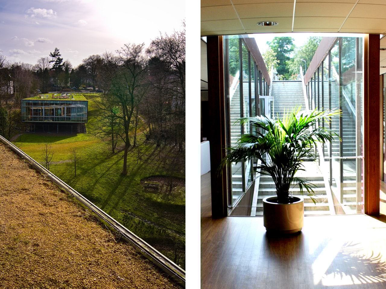 The NTR is one of the buildings that together make up the “campus” of the cooperating television companies VPRO, VARA, NTR and RVU that form Net3, the third channel of the Dutch Public Television Broadcasting System. By proposing a single-story office building and digging it like a shaft into the top of the steepest flank of Hilversum Hill it becomes invisible from the city. The landscape continues up over the grass covered roof, creating a green space for the office workers to relax in during lunch. It even grows chives!