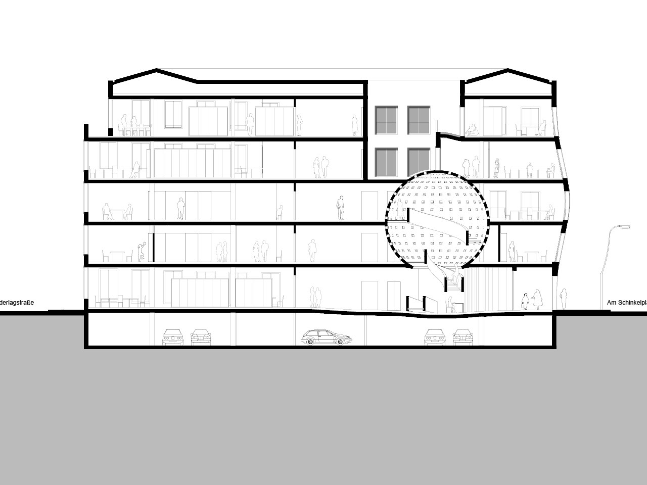 The design for the office building at Schinkelplatz is based on an approach that reflects the surroundings and the history of the site. The new block is fitted precisely into the urban reconstruction of Berlin Mitte and refers to the historical context with an interpretation of the classical city palace. Five conceptual components of the design determine the external appearance, the quality and functionality of the interior spaces of the building. The first, the main entrance of the building faces the square, and leads into a large lobby which is topped by a spherical stair-void. The lobby is connected to the internal courtyard for additional light, and on each floor an entrance hall also faces the garden. The second is that the void of the lobby emerges as a distance echo in the façade facing Schinkelplatz: the centre of the building is highlighted by a gently rounded bay window, which indicates the entrance of the building. This multi-storey bay window is most plastic element of the design, and is intended as a reference to the massive domes of the surrounding environment and a critique of the contemporary tendancy towards non-hierarchical facade subdivision.