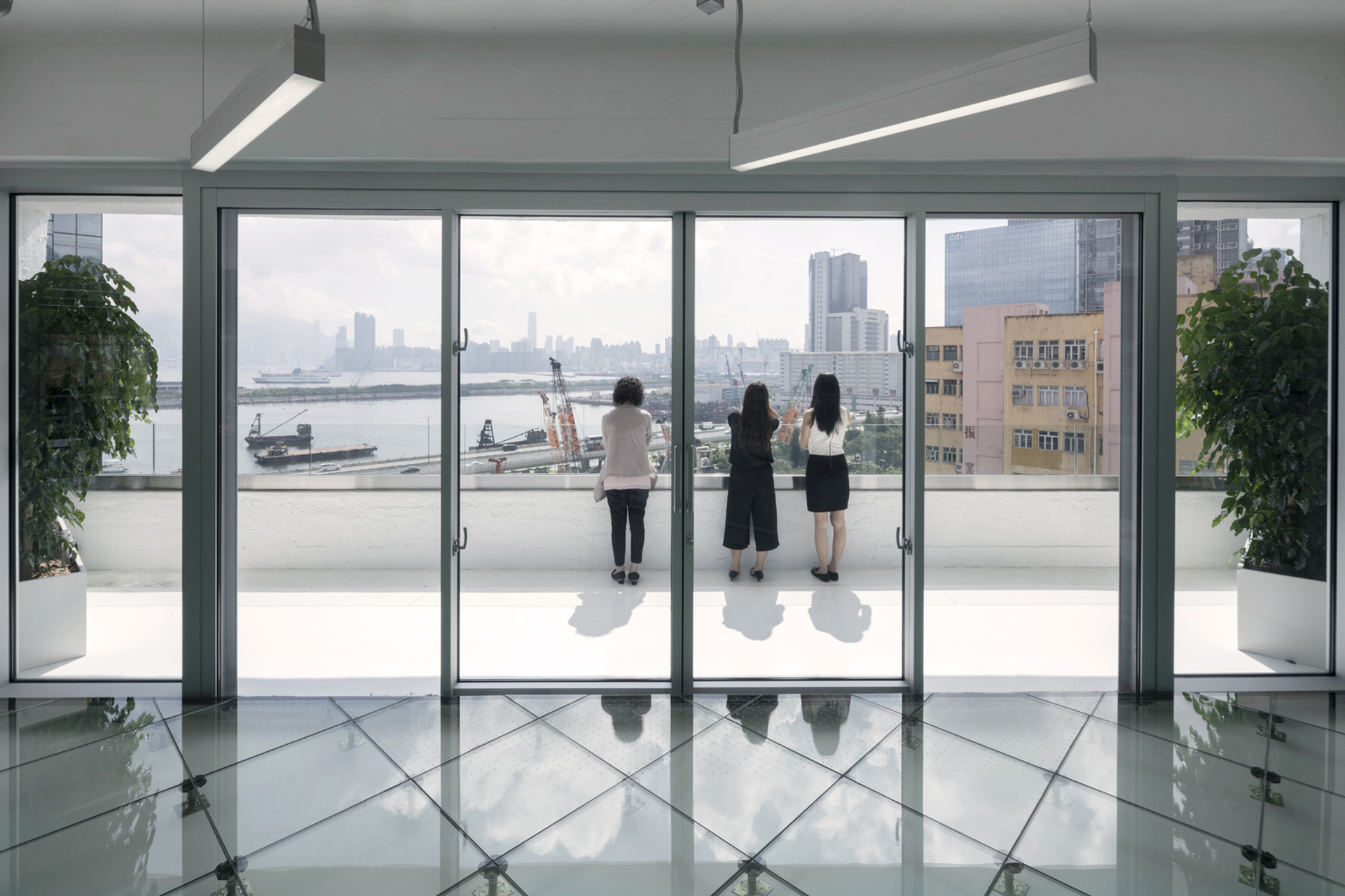 133 Wai Yip Street takes a new approach to development in Hong Kong, reusing the existing building and reinforcing the area’s original character rather than wiping the slate clean with solely new builds. The goal was to expose the inner workings of the building including the structure and installations, but not only this, to show the free-flow movement within the building, the inner-workings of the companies inside and the technical components which allow the office to function. Glass lifts in glass shafts reveal everyone’s movements up and down the building; even the fire-stairs are encased in fire-resistant glass.