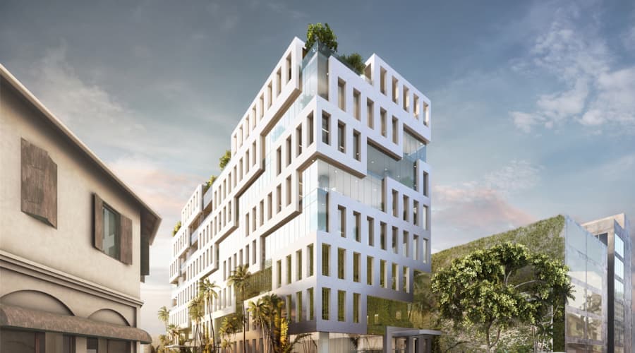 The façade design is inspired by traditional Sri Lankan weaving patterns. This pattern, formed by alternating verandas, panoramic windows, and solid rendered walls, creates a connecting series of outdoor spaces throughout the building, from the ground floor public realm, to the verandas stepping up the façades, to the building’s rooftop sculpture garden.