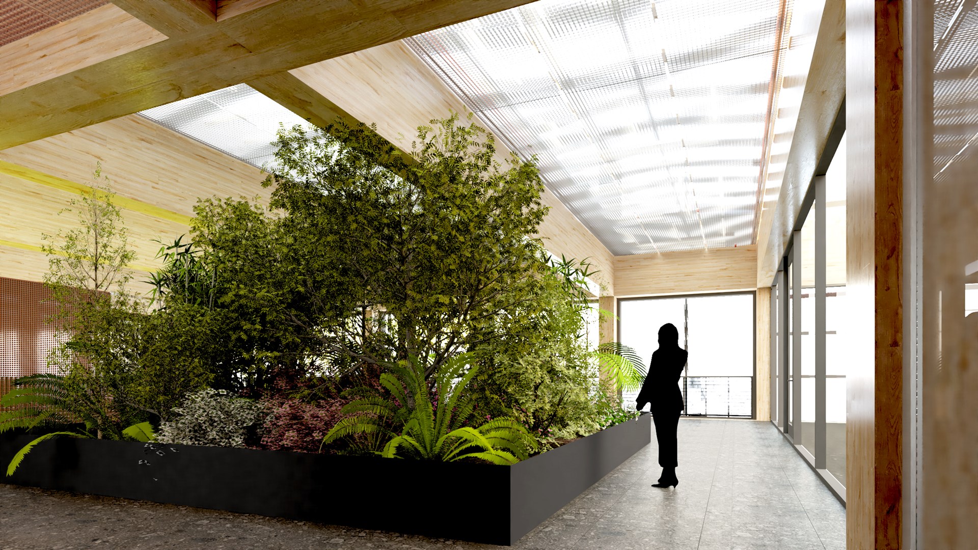 The current brick façade and interiors of the warehouse will be restored and repaired with the existing concrete frame adapted to support three new levels of timber-framed floors above. These new levels will allow for additional programs and for the experience of diverse atmospheres across all levels.