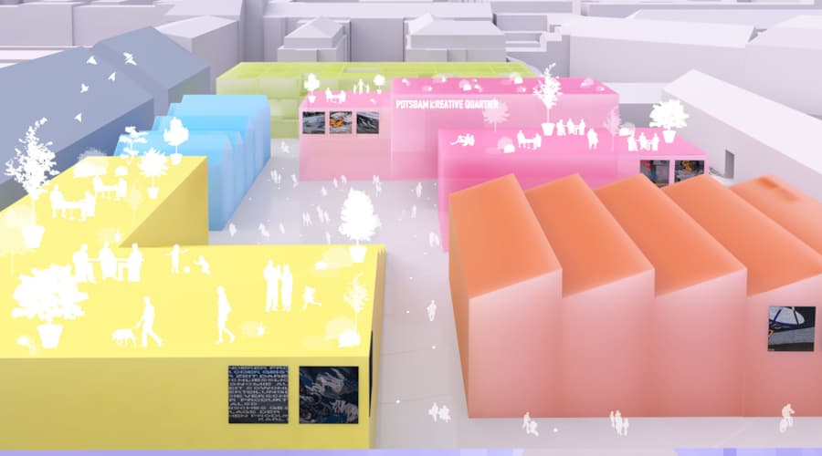 The new creative quarter Potsdam will be built in three construction phases. First, affordable studio space will be realized in 2023 to provide a seamless transition for the artists now located in the Rechenzentrum. The first construction phase will involve the creation of a building on the site of the former Langer Stall, based on the original building volume and incorporating the building’s preserved end façade. The second phase covers the realization of the Village buildings within the building block. In a last phase a housing block along the Werner-Seelenbinder Strasse will complete the ensemble.