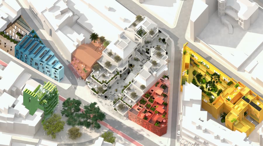 The seven diverse buildings, each executed in a different colour and material, add 60 rental homes in a variety of styles and sizes intended for local inhabitants who work in the surrounding area, as well as additional commercial space. The many bright colours, emphasised by the Mediterranean sun, advertise the vibrancy and rejuvenation of the neighbourhood. Each of the buildings brings not only its own character, but also unique amenities, with facilities such as restaurants and bars being public while amenities such as pools are accessible to residents of all buildings within the plan.
