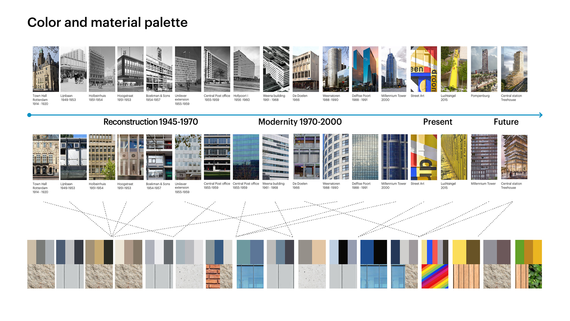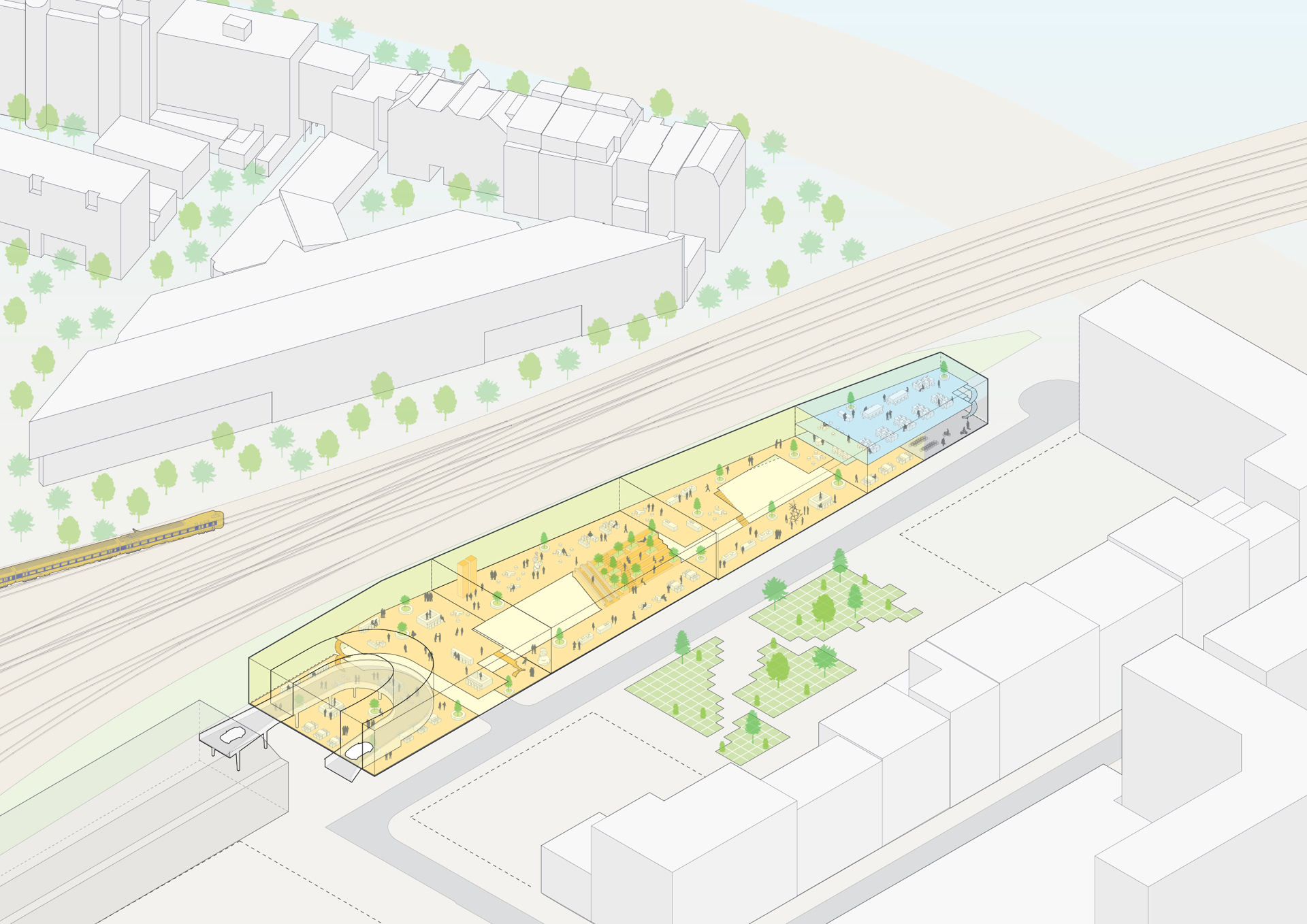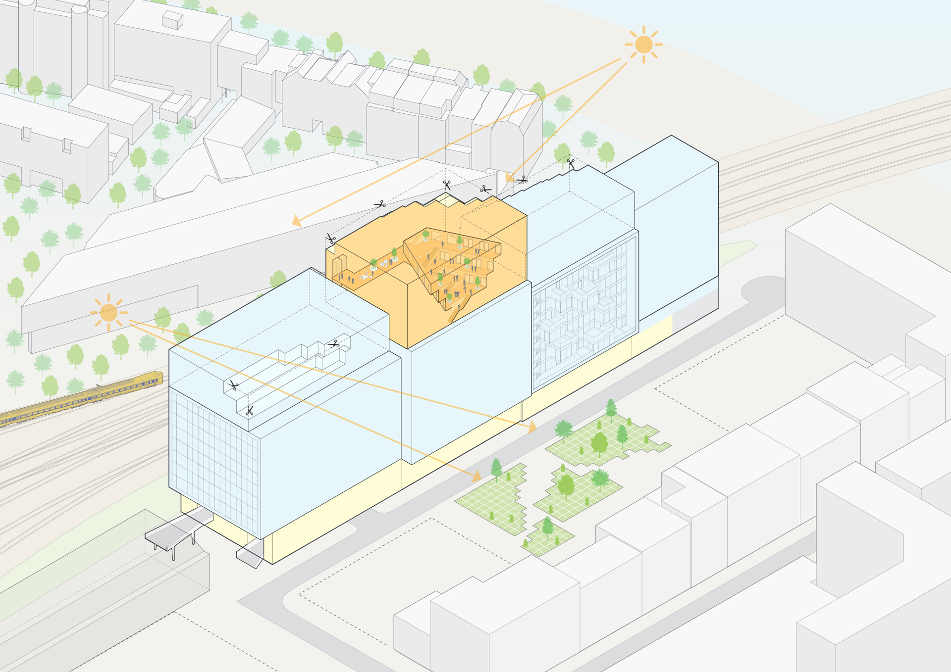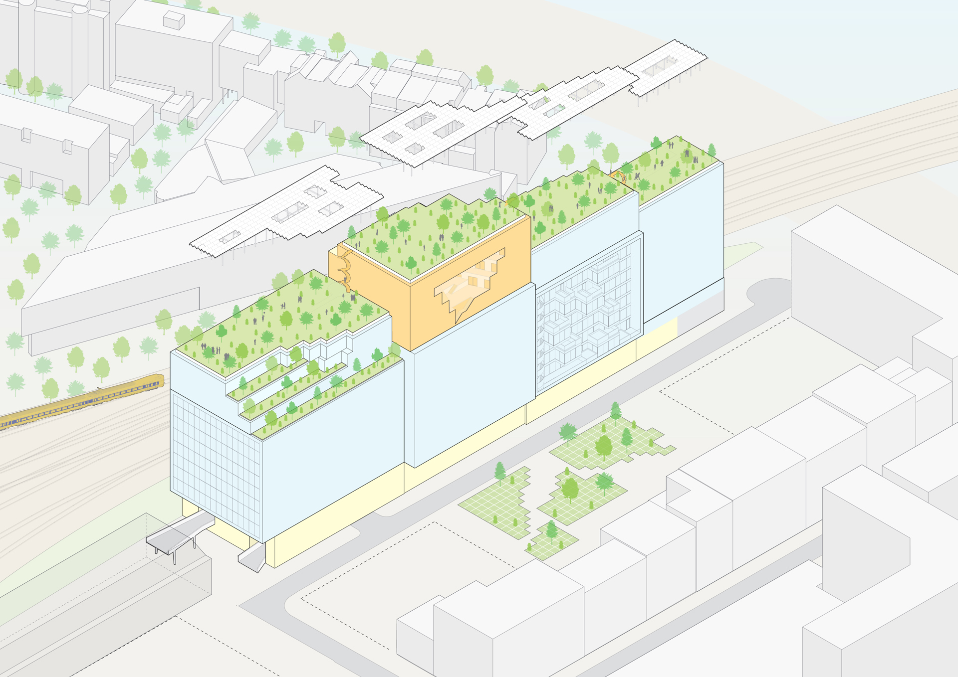The first step in this process was the building’s massing, which echoes the façade of the Schiekadeblok along Delftsestraat. The building is divided horizontally into four sections, each with a clearly defined plinth level and one or two blocks above, adding a total of 11 new “Schieblocks” to the area. The resulting composition echoes the nearby reconstruction blocks, but stacked vertically, making the plea for a “second reconstruction”; the next phase of densification for Rotterdam. As an example of how this additional densification can be achieved while maintaining the city’s quality of life, some of the top blocks are carved according to the angle of the sun, preventing shadows being cast on the homes on the other side of the railway tracks.