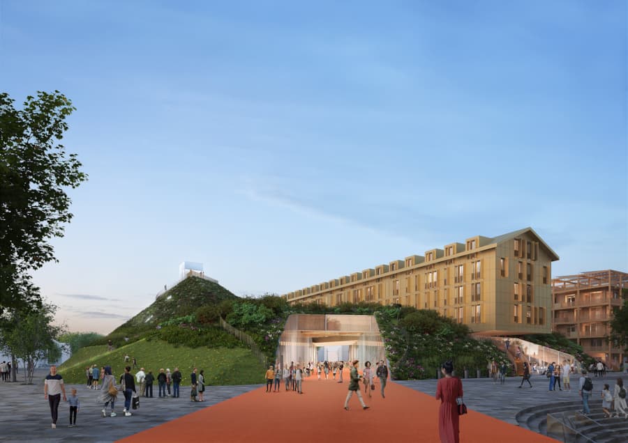Located at the heart of Franklin Mitte, the green hill is a key element of the MVRDV-designed masterplan for the new neighbourhood in Mannheim. Part commercial centre, part park, the hill is topped by a balancing residential block that adds 34 apartments to the ensemble, providing the neighbourhood with a central place for meeting their essential needs, from meeting and relaxing to working and grocery shopping.