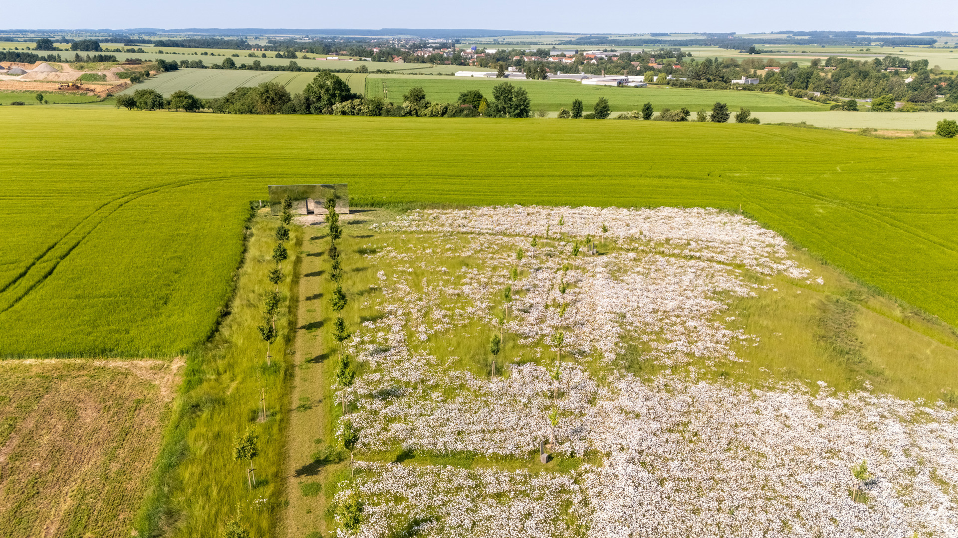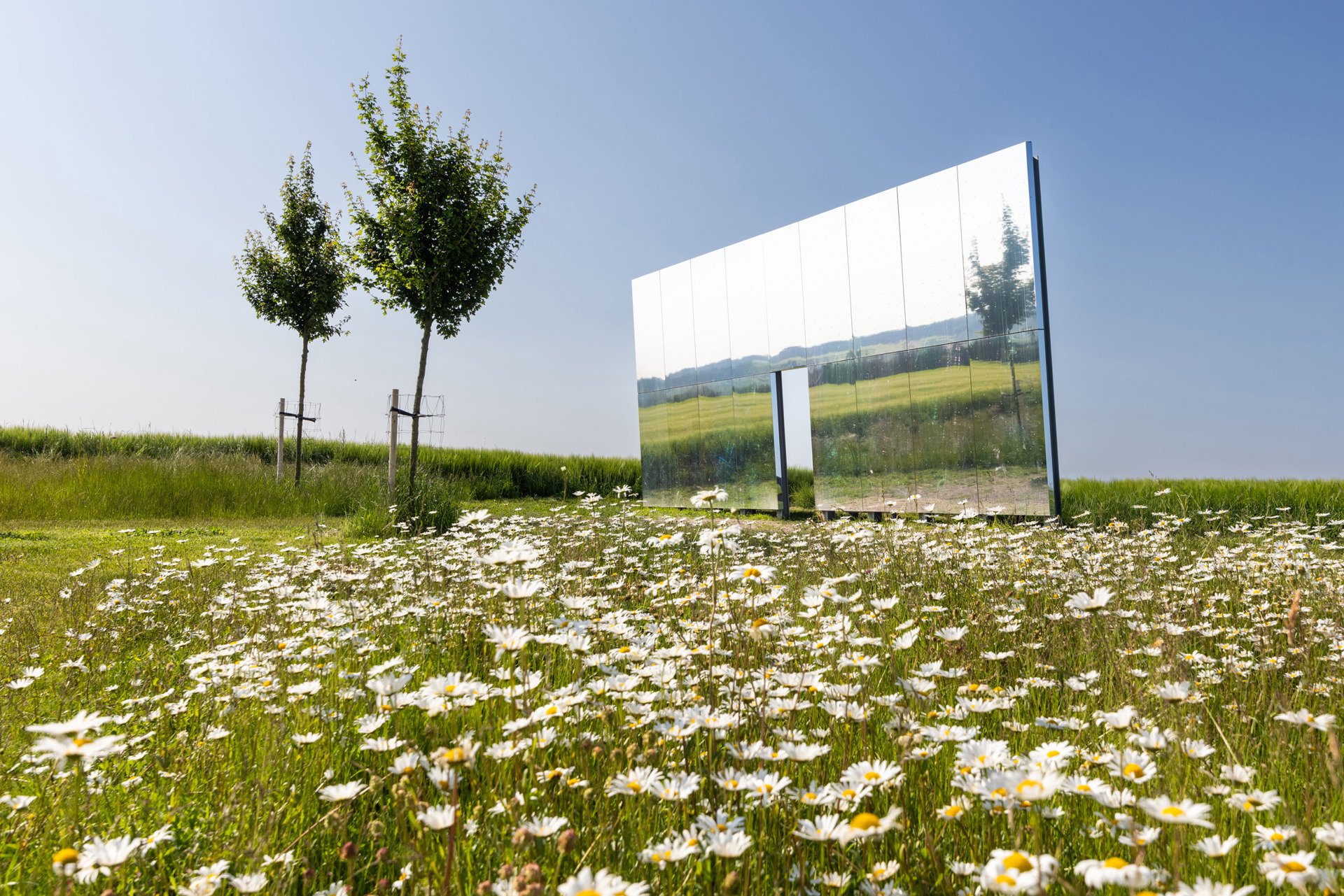 Located at the end of a tree-lined path, the door acts as both a threshold and a viewpoint. The installation takes the form of a 10 × 4 metre wall made of mirrored Dibond, punctured by a single opening that allows visitors to pass through it. Tilted five degrees forward, its reflective surfaces capture the treetops and surrounding greenery, extending the rhythm of the landscape and merging reflection with reality so that city, countryside, and visitor briefly align in a single frame. Passing through the opening shifts perception, as the path opens onto a wide panorama of rolling fields beyond the park’s edge.