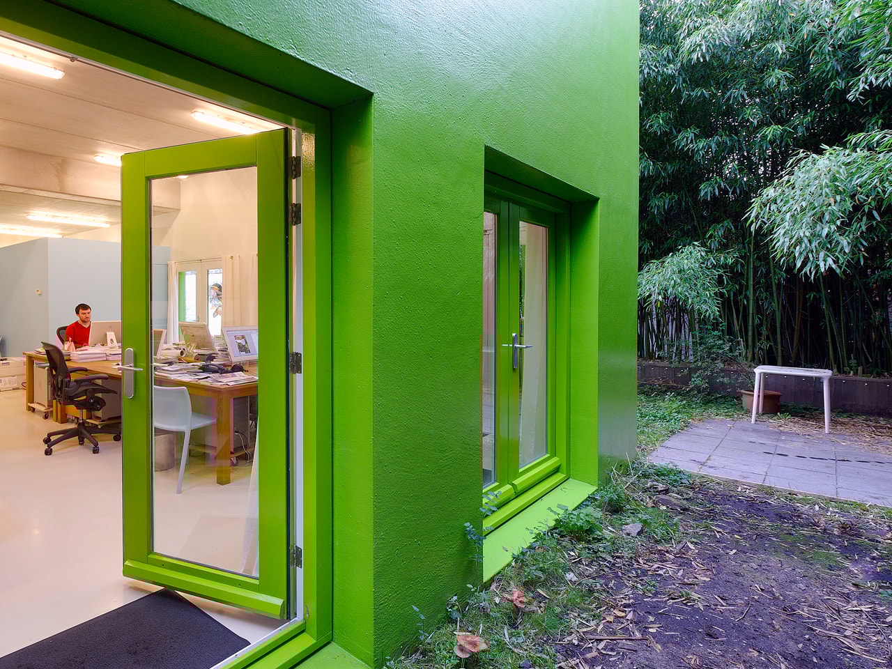 In the hidden inner court of an Amsterdam Block in the east of the city, the client, owners of the renowned graphic design firm Thonik, desired a house, both for living and working, but the municipality only allowed them an office.