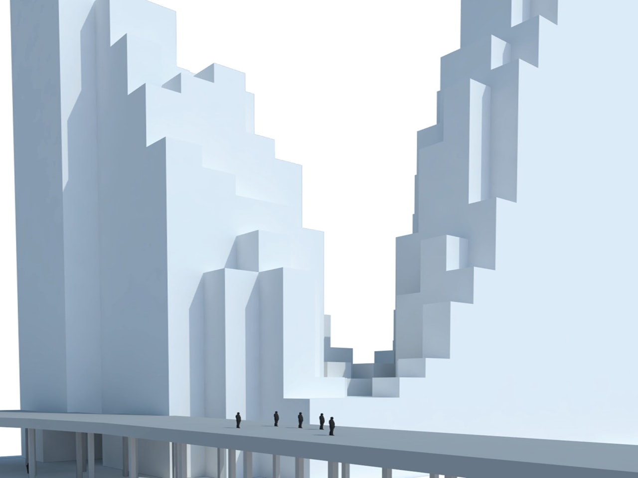 First we begin with the building plot, and extrude it up to the maximum height allowed by the city for a building on that plot. The city also expects two towers to be built, with exact spatial requirements being decided by the developer, including a tower for rent and a tower for sale. By carving out a void from the maximum volume, and by sculpting it, it creates create a volume which is open to light and views, connecting the highline to the river both physically and more metaphorically.