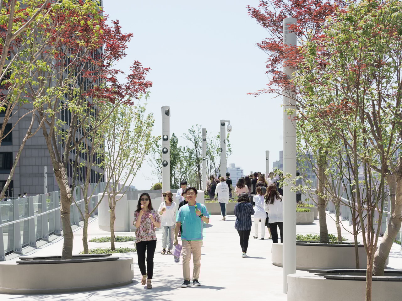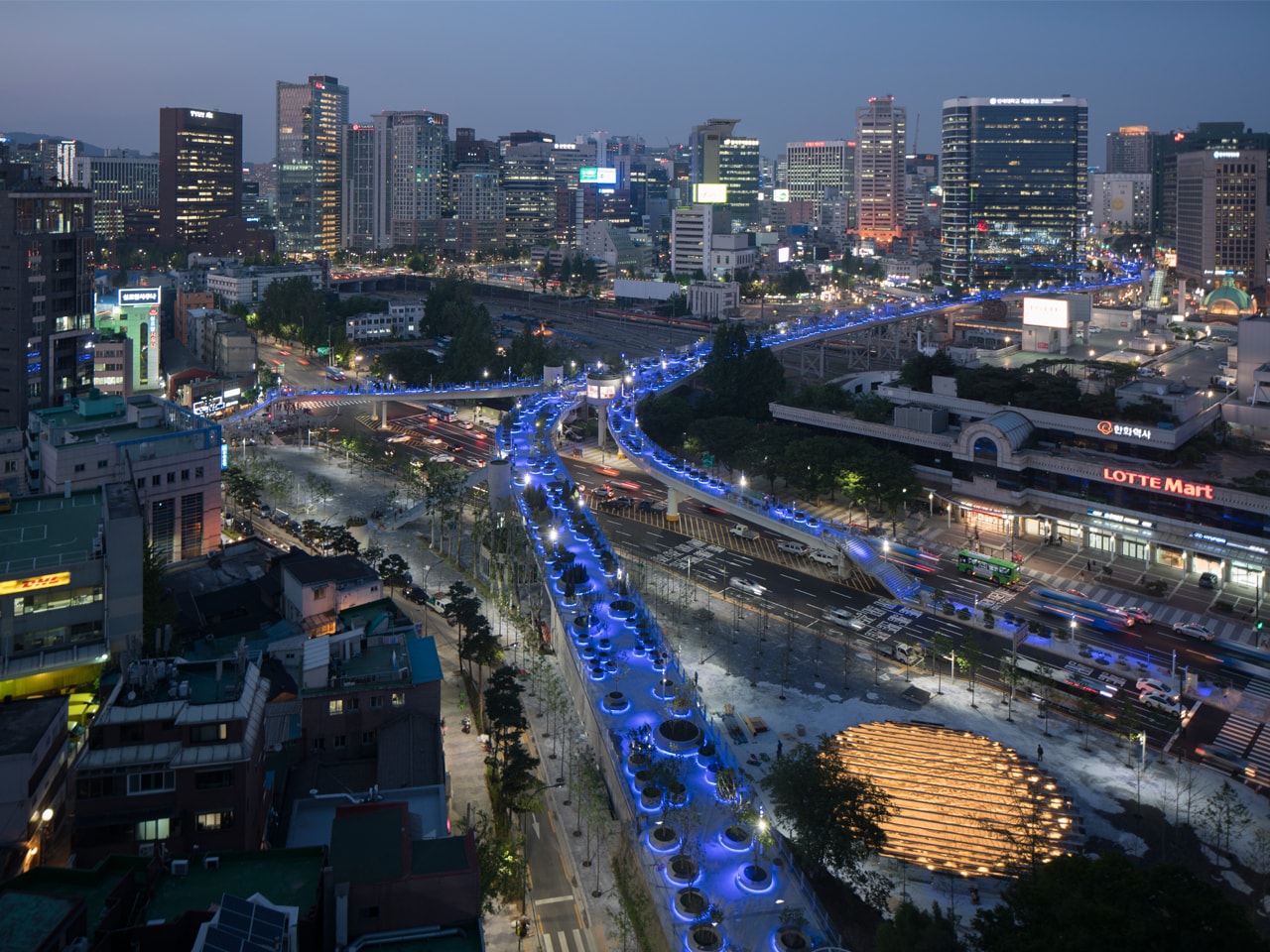 Located in the heart of Seoul, a true plant village has been realised on a former inner city highway in an ever-changing urban area accommodating the biggest variety of Korean plant species and transforming it into a public 1024-metre-long park gathering 50 families of plants including trees, shrubs and flowers displayed in 645 tree pots, collecting around 228 species and sub-species. In total, the park will include 24,000 plants (trees, shrubs and flowers) that are newly planted many of which will grow to their final heights in the next decade.