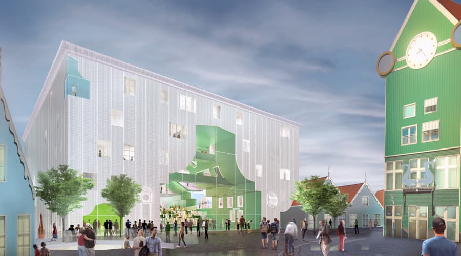 MVRDV have proposed a cubic volume in which the Zaan house is visible as a silhouette. Each of the institutions it will house will receive its own space in the silhouette of a Zaan house of a different colour, giving each a recognizable visual identity.