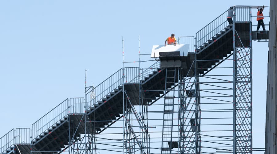 We were informed that ten years ago West8 had created a temporary stair made of scaffolding leading onto the roof-top of Las Palmas, a striking historic building in Rotterdam. There are similarities between the two stairs, so we want to credit Adriaan Geuze,  West 8 and DaF for this wonderful idea. In our design process, we started with the dream of a permanent escalator which then turned into a temporary project made of scaffolding. Dutch construction legislation then made the stair into the current design. Even though we did not copy the stair design by our colleagues, we still want to express our respect for the earlier project and its makers.