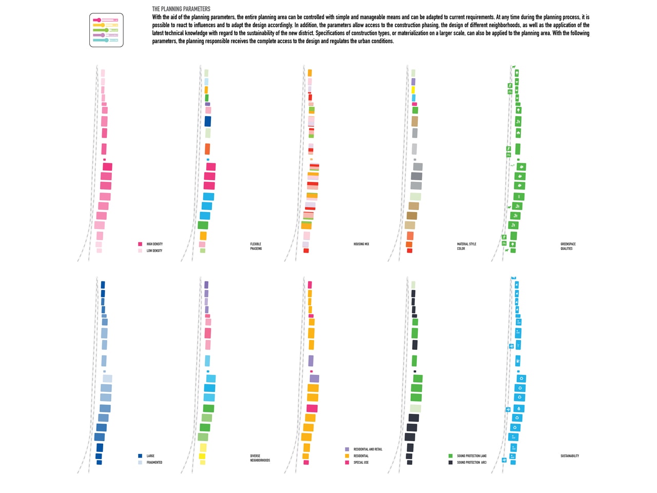 Walls and small hills are modelled as a noise-protecting landscape between the new planning and the railway tracks. This creates, on the one hand, areas which might serve as a park or play zone for the new Neighbourhood. On the other hand, the basis for the green belt is Feldmoching. The surrounding landscape is linked with the new planning and, as it were, connected with the existing structure.