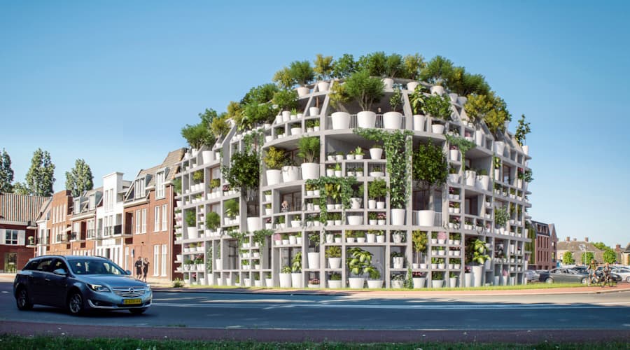 Containing a new office space for a real estate developer, Stein, on the ground floor, five apartments on three floors above, and underground parking, the Green Villa develops one end of a surface car park on the southern edge of Sint-Michielsgestel. The project was initiated and is being developed by MVRDV’s co-architect, Van Boven Architecten, who wanted to create a landmark project for the village while also being socially conscious and environmentally progressive.