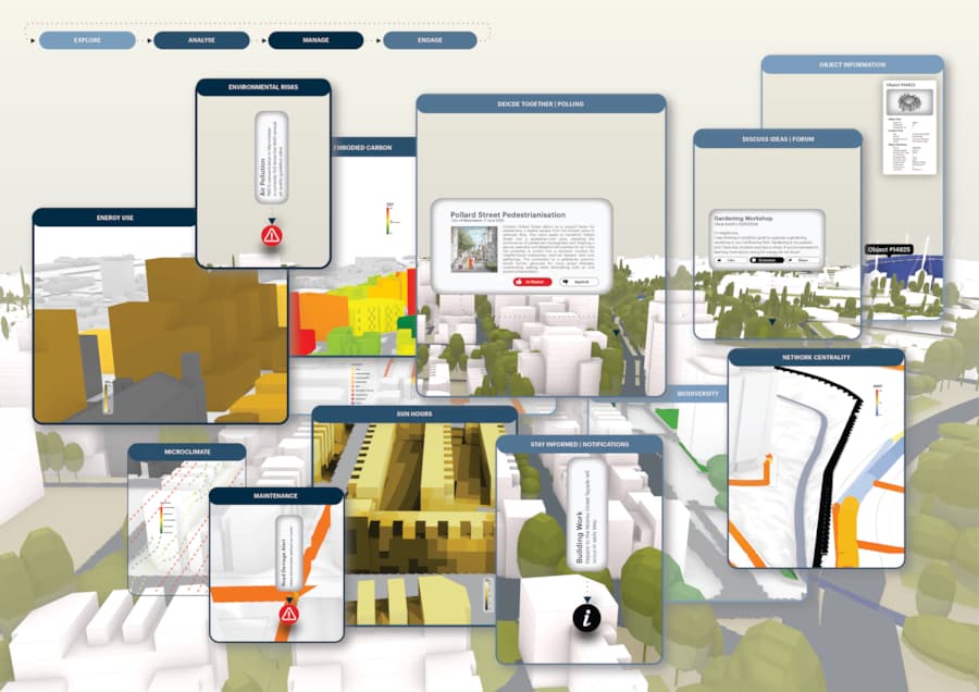 Inside, the renovation keeps characteristic elements such as the staircases and the natural stone floors, but it also adapts the buildings to bring them in line with modern standards, where offices are increasingly seen as spaces for meeting and collaborating. Dividing walls have been removed, so that the building is less compartmentalised, while various interventions make the building more sustainable. The roofs are now used more intensively, with greenery and pavilions that enable interaction between all users of the complex and which can be used for events. Solar panels are also introduced, helping the development achieve BREEAM Outstanding sustainability certification.