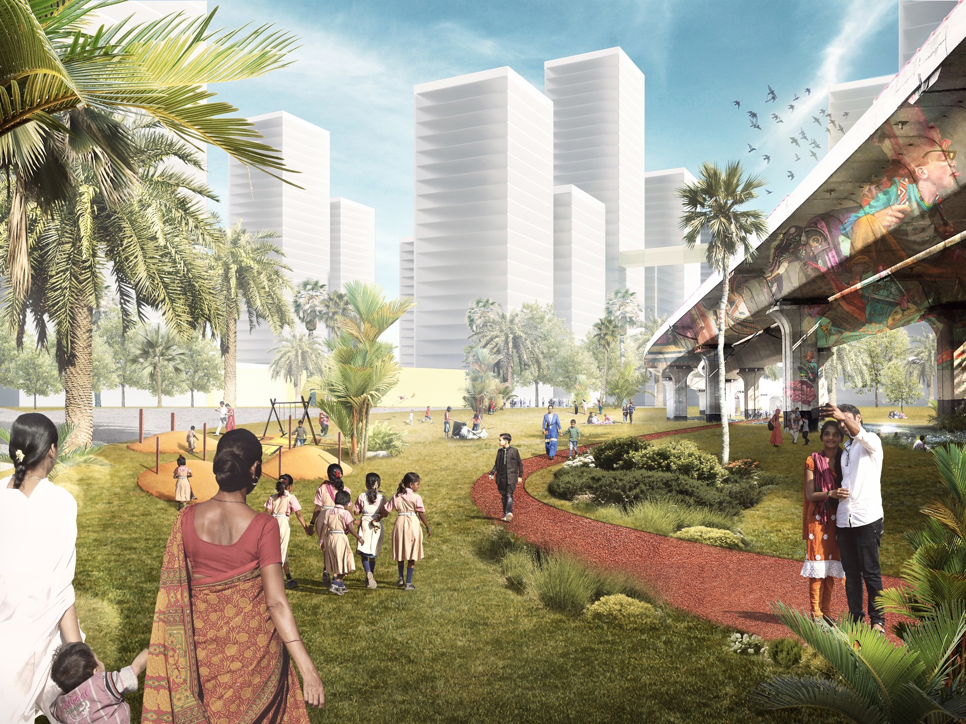 MVRDV’s intensive research study and masterplan for Barapullah Springs presents a vision for the rehabilitation and renewal of an open sewer in the heart of New Delhi, India. The project is an innovative yet feasible policy proposal to test a new method of good governance with a direct re-investment of funds generated on site for the larger public well-being. Using the existing infrastructure as a starting base, the design creates a vital new thoroughfare for the city that not only ensures access to clean water for vulnerable populations, but also connects the city’s neighbourhoods and cultural treasures with a comprehensive slow-traffic corridor. The project also offers a strategy to include bicycle lanes and shaded pedestrian promenades throughout the city.