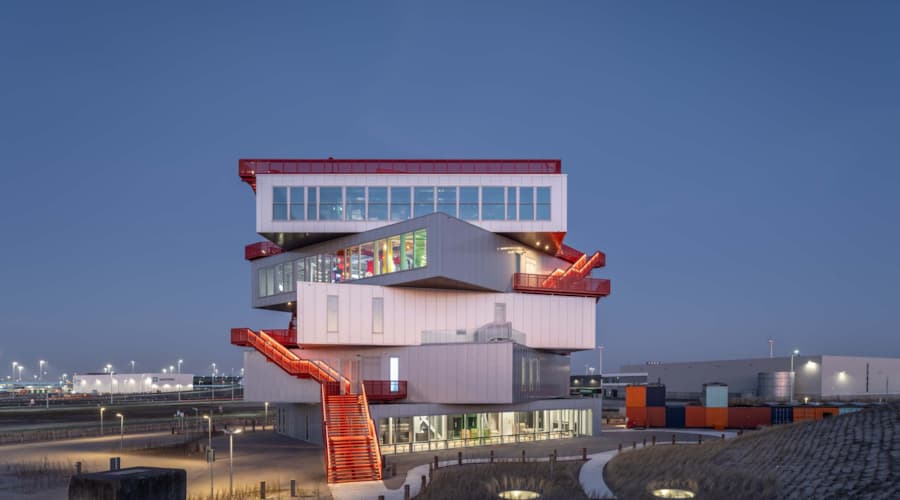 Occupying a prominent location on the beach of the port’s Maasvlakte 2 artificial land extension, Portlantis creates a beacon that is visible from afar. It takes a practical, no-nonsense approach to its educational task, channelling the spirit of the port with its simple functionality, dramatic presence, and industrial materials. The shape of the building is a direct response to the activities taking place inside and out: each floor is square in plan and has a large panorama window that frames a different view of the surroundings. The orientation of each floor, and the direction its main window faces, corresponds to its function: on the ground floor café, this window faces westward and provides an intimate view of the dunes, while diners in the fourth-floor restaurant can enjoy views of both sunsets over the North Sea and the illuminated skyline of the port at night.